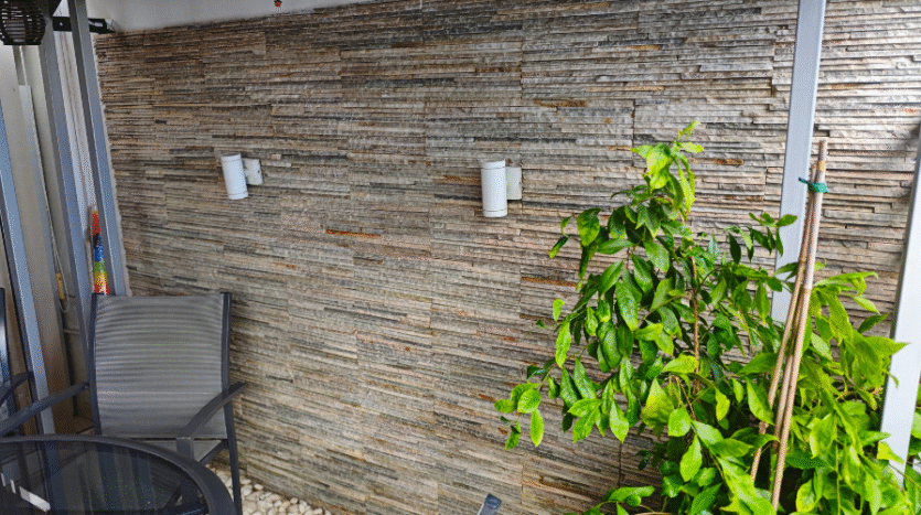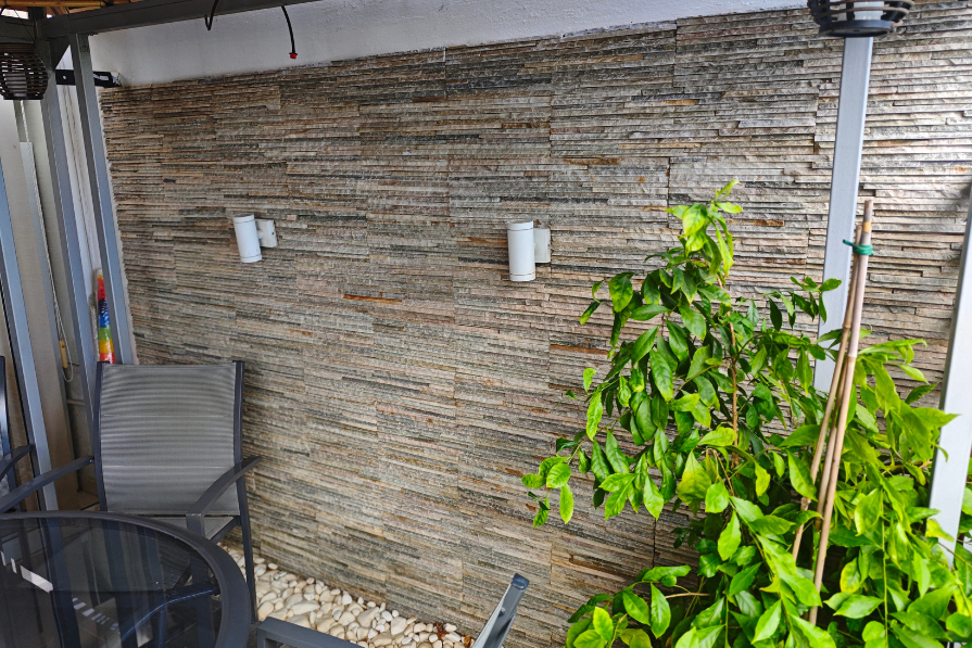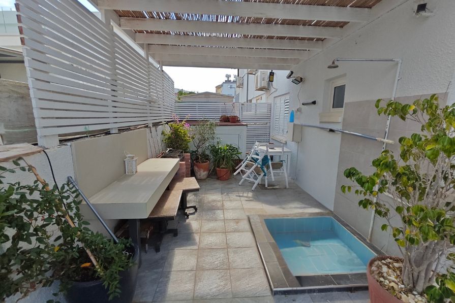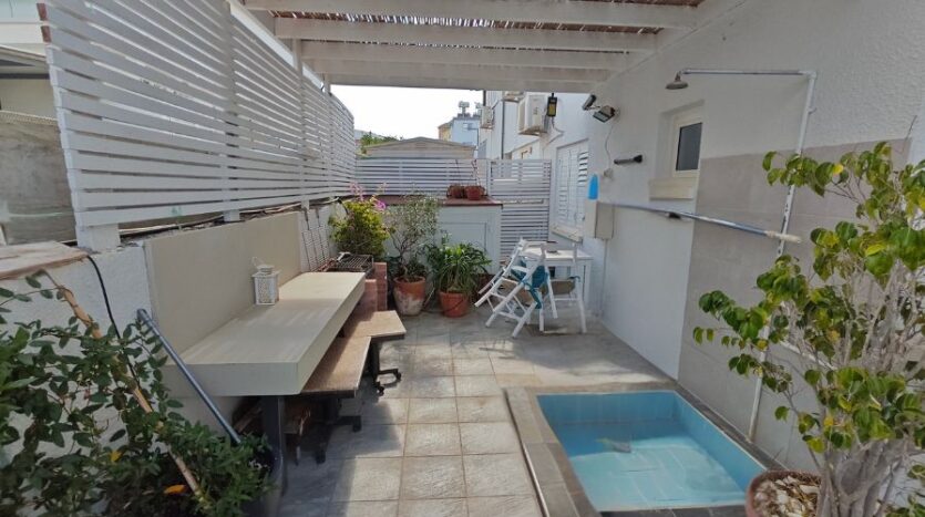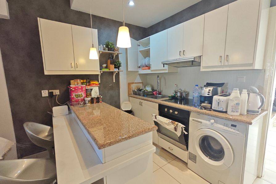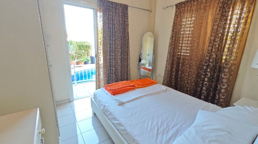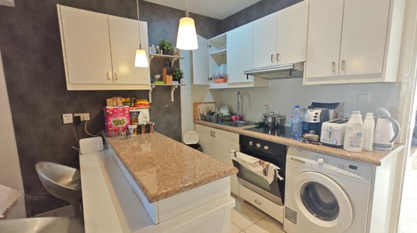 The apartment itself enjoys an open plan design with a fully fitted kitchen, dining area and living room which looks out to the private yard and the private swimming pool – a peaceful spot to enjoy your morning coffee or have a barbeque lunch with your family! There are two good-size double bedrooms with fitted wardrobes sharing a family bathroom.