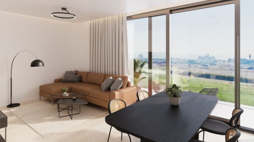 The open-plan living space is bright and airy, thanks to the floor-to-ceiling windows that allow natural light to flood the apartment and offer uninterrupted views of the sparkling sea. The living and dining areas flow seamlessly, offering a versatile space for both relaxation and entertaining. Step outside onto the balcony and enjoy your morning coffee or evening sunset while soaking in the beautiful surroundings.