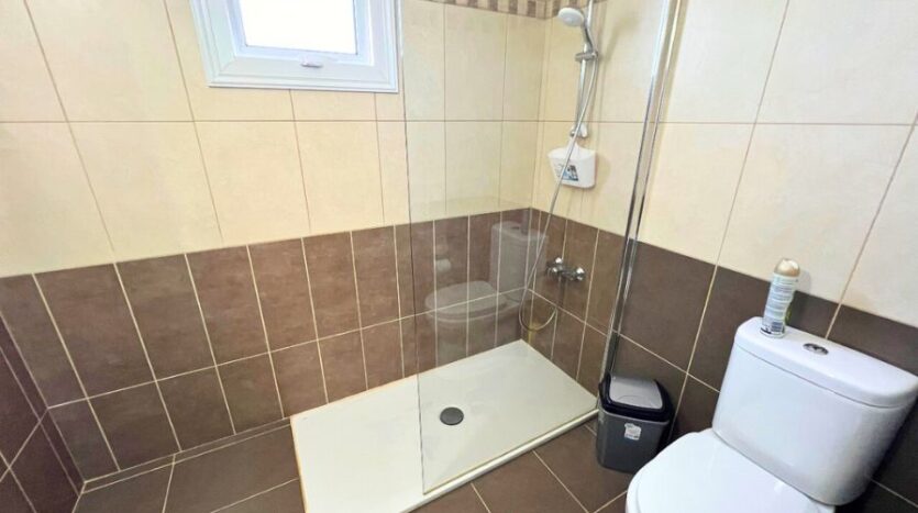 All three bedrooms are located on the upper floor, each equipped with fitted wardrobes for ample storage. The master bedroom includes an en-suite shower room, while the remaining two bedrooms share a well-appointed main bathroom. Large windows throughout the upper floor bring in natural light and provide views of the sea and surrounding area, adding to the villa’s tranquil, coastal atmosphere.