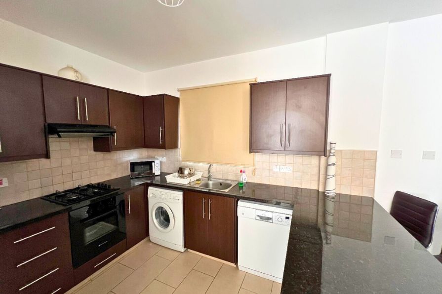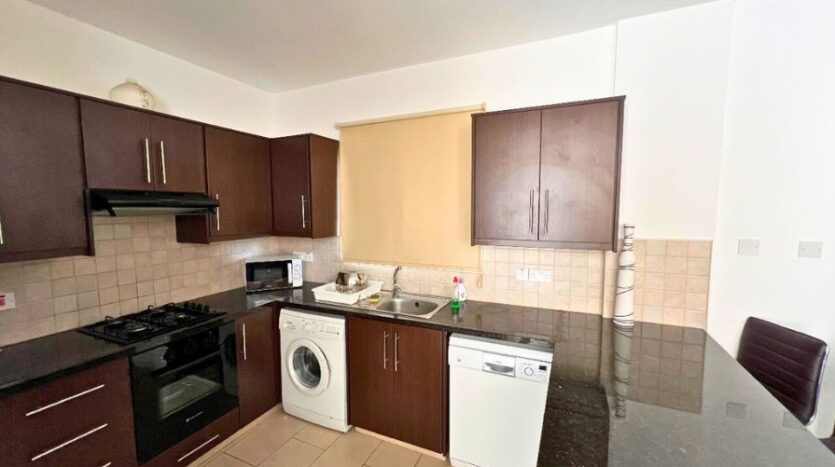 Inside, the villa is tastefully decorated and sold fully furnished, offering a turnkey solution for immediate occupancy or rental. The spacious open-plan layout includes a comfortable living area and a fully fitted kitchen complete with modern appliances and a bar-style counter, ideal for casual dining and entertaining.