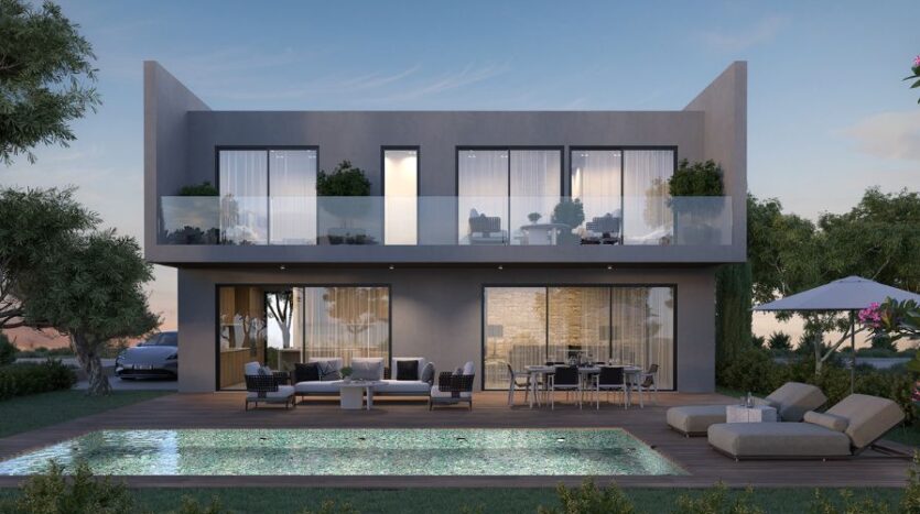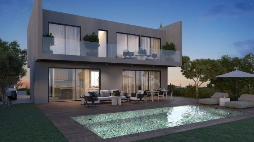 The villa features an open-plan living and dining area, designed to create a bright and airy atmosphere, with large windows that bring in plenty of natural light. The living area seamlessly connects to the outdoor space, where you’ll find your own private swimming pool, ideal for relaxing or entertaining in the warm Mediterranean climate. There is also a guest toilet on the ground floor, adding extra convenience for visitors while keeping the en-suite bathrooms private for residents.