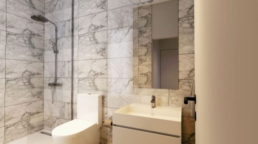 There are two good-sized bedrooms with sleek, integrated wardrobes and large windows creating a bright and relaxing environment. The bathrooms are modern with a shower over the bath. The property also comes with covered parking and a storage room.