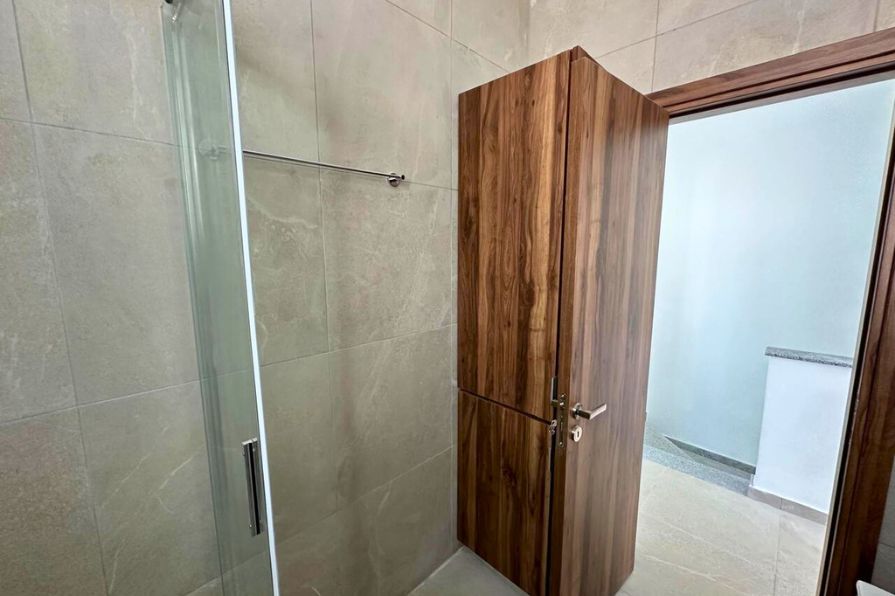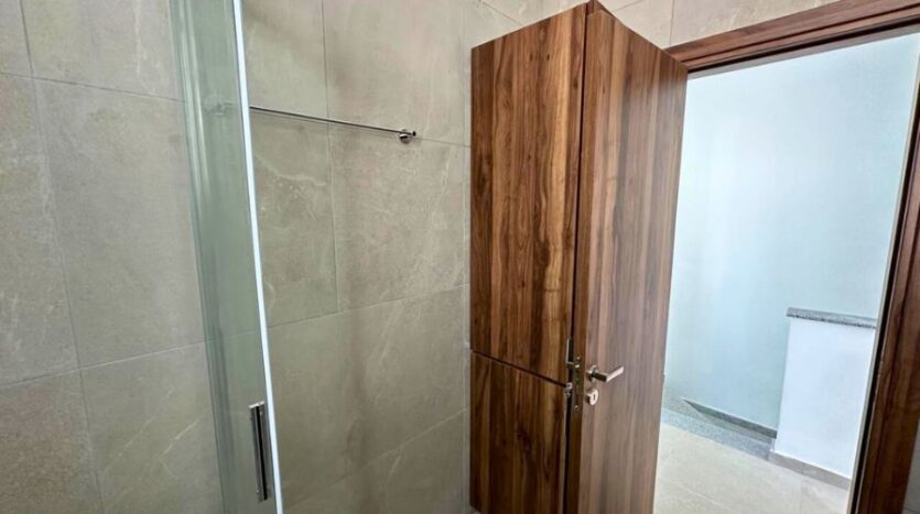 Upstairs, you’ll find two well-sized bedrooms, both featuring fitted wardrobes. One of the bedrooms enjoys access to a private balcony, ideal for morning coffee or evening relaxation. A sleek main bathroom with a walk-in shower completes the upper level.