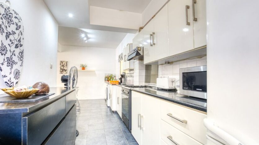 The apartment features a bright open-plan living and dining area that flows seamlessly into a slightly separated, fully fitted kitchen, offering a sense of division while maintaining a spacious feel. The kitchen comes equipped with all essential appliances and plenty of cupboard space, perfect for everyday living and entertaining.