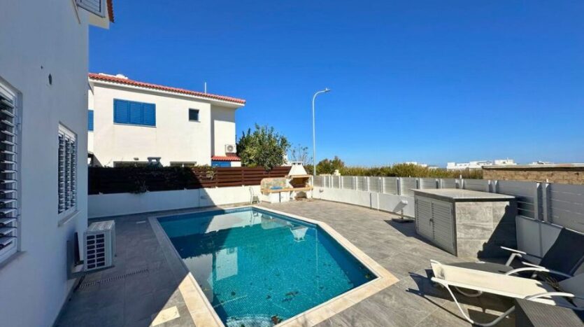 The villa features a private swimming pool surrounded by a generous outdoor patio, thoughtfully designed with both a sitting area and a relaxed lounge space around the pool. An outdoor BBQ area and outdoor shower enhance the outdoor living experience, creating an inviting setting for entertaining or unwinding in the Mediterranean climate.