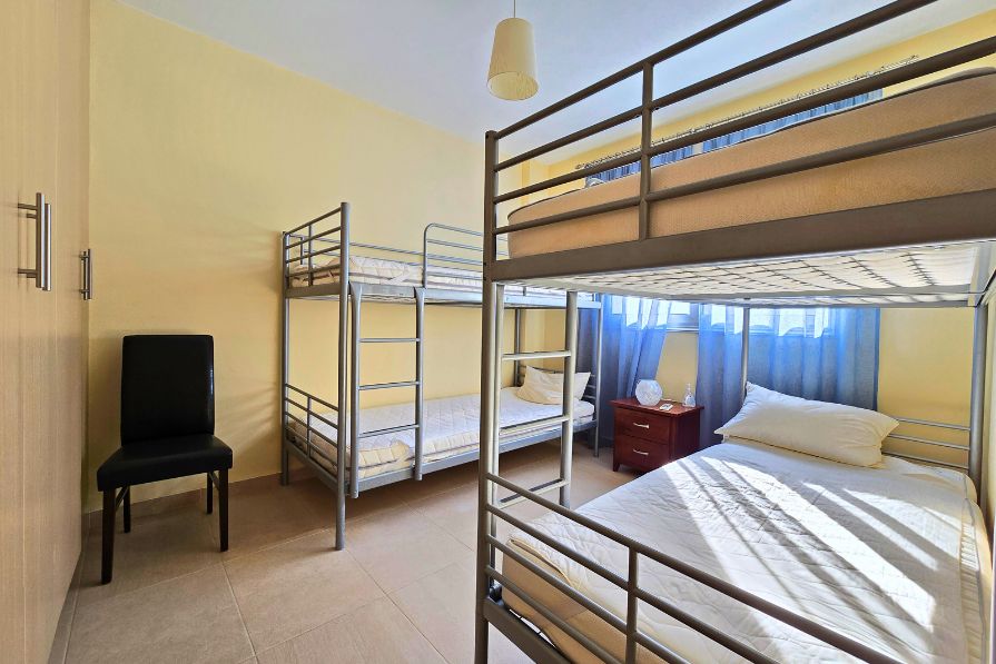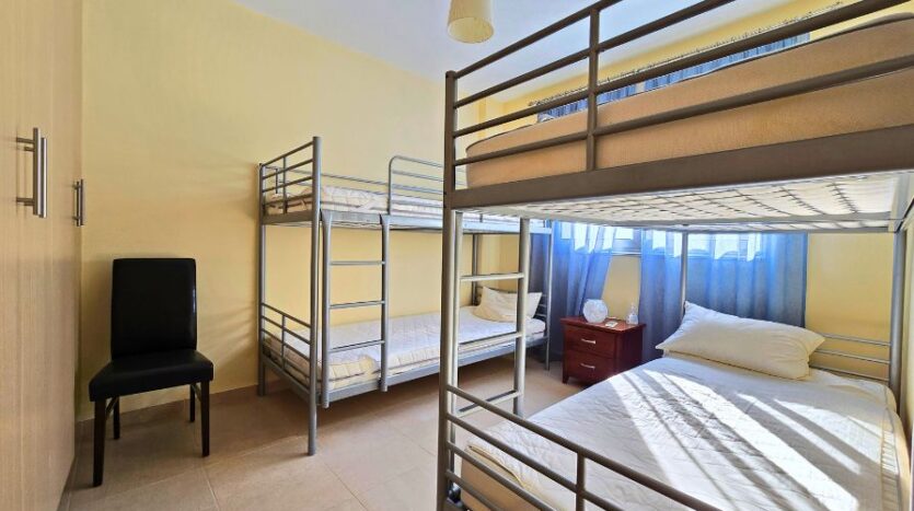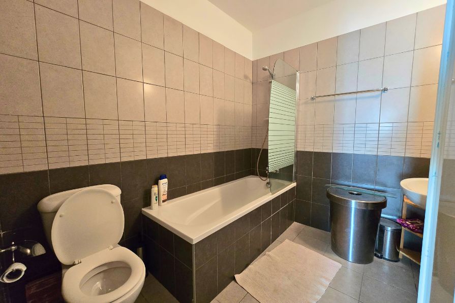 The two bedrooms are well-proportioned and thoughtfully designed, each offering built-in wardrobes and large windows that allow natural light to flow in. The bedrooms share access to a modern family bathroom with high-quality fixtures and a bathtub.
