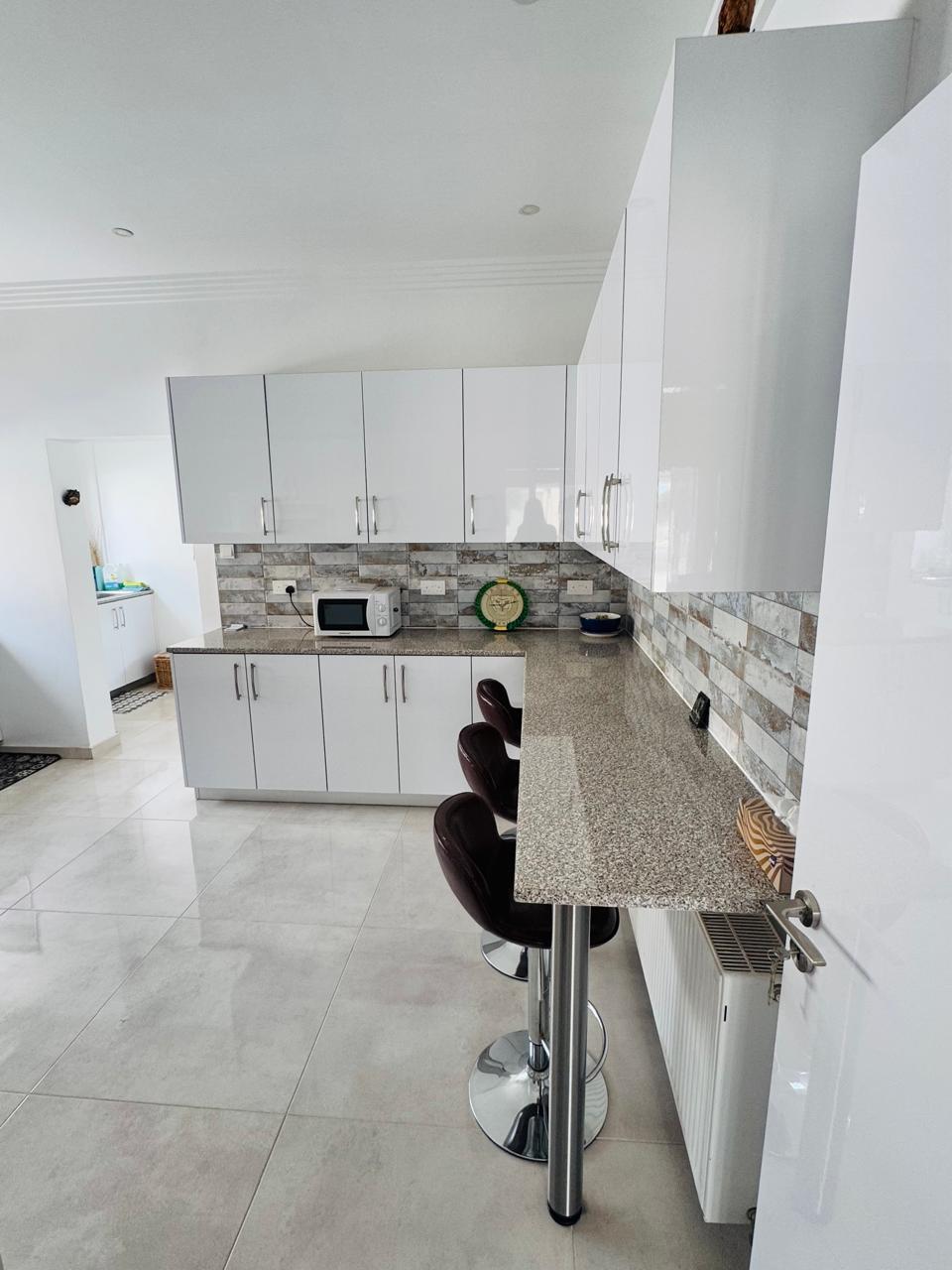 Upon entering the house, you are welcomed by a stylish dining area and a cozy, elegantly decorated living room, perfect for relaxation or entertaining guests. The modern, fully equipped kitchen features top-quality electrical appliances, making it ideal for preparing delicious meals.