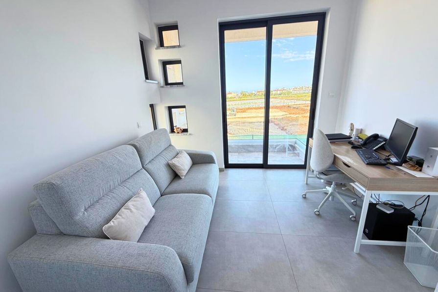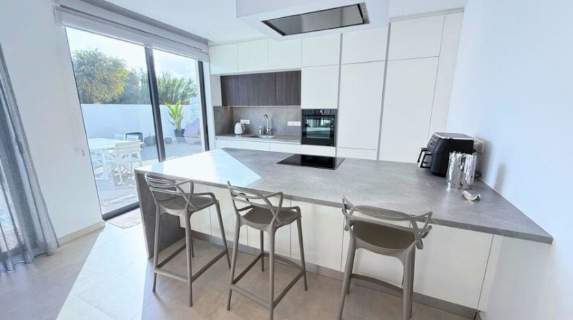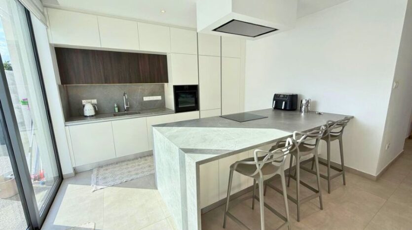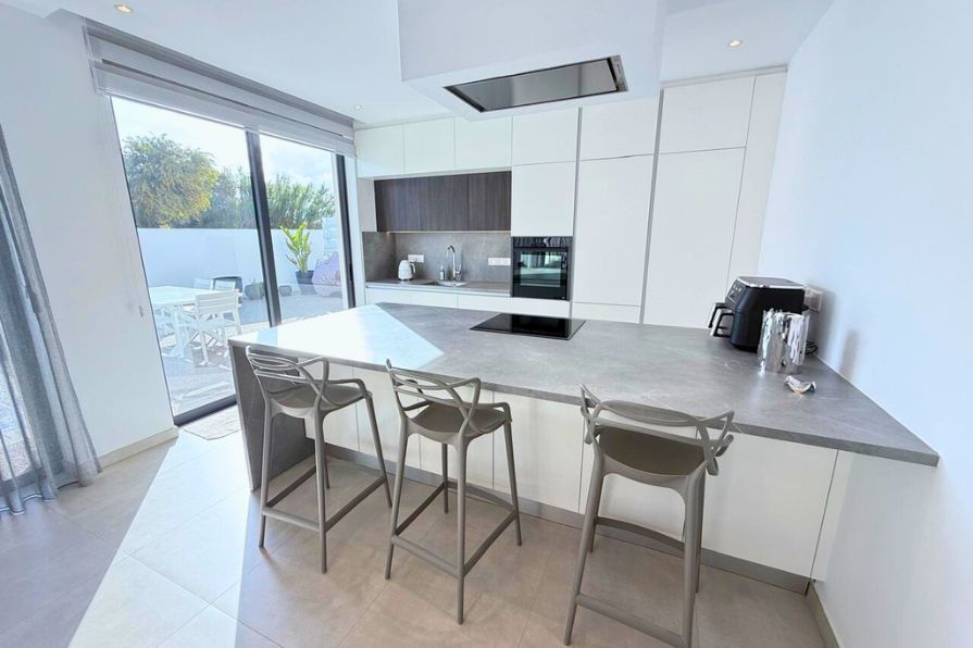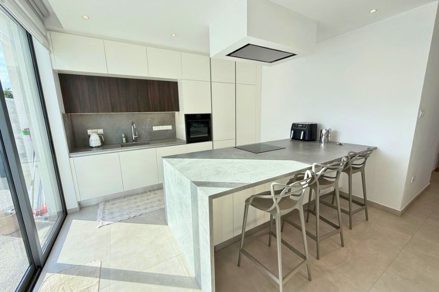 Inside, the open-plan layout is both stylish and functional. The fully fitted kitchen is a focal point, equipped with high-quality appliances, ample storage and a central island that doubles as a breakfast bar and prep space—ideal for modern living and casual dining. The adjoining living and dining areas are fully furnished with tasteful, contemporary pieces that enhance the villa’s clean aesthetic and are bathed in natural light from large windows and patio doors that open directly to the poolside terrace. On this floor, you’ll find a modern shower room- ideal for guests.
