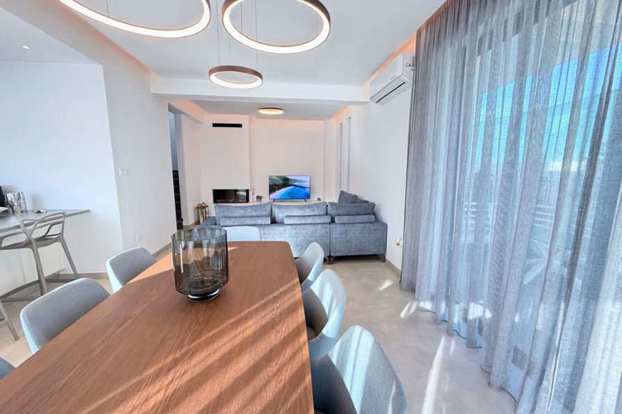 At the heart of the property is a stunning private overflow swimming pool, seamlessly integrated into a beautifully landscaped outdoor space ideal for sunbathing, lounging, or entertaining. The villa also features a spacious rooftop garden offering panoramic views of the Mediterranean Sea—perfect for enjoying sunsets, hosting guests, or relaxing in complete privacy.