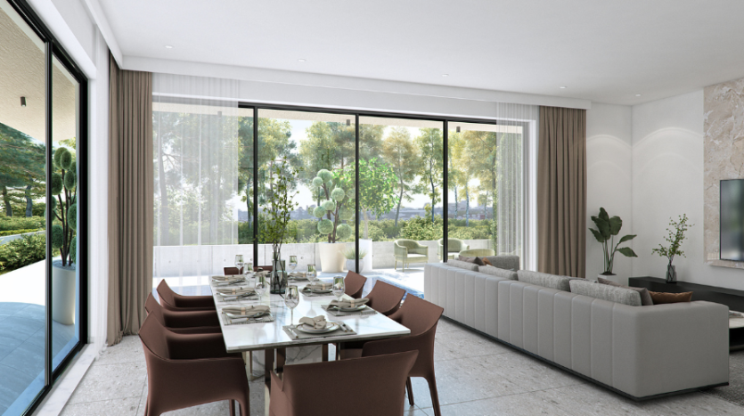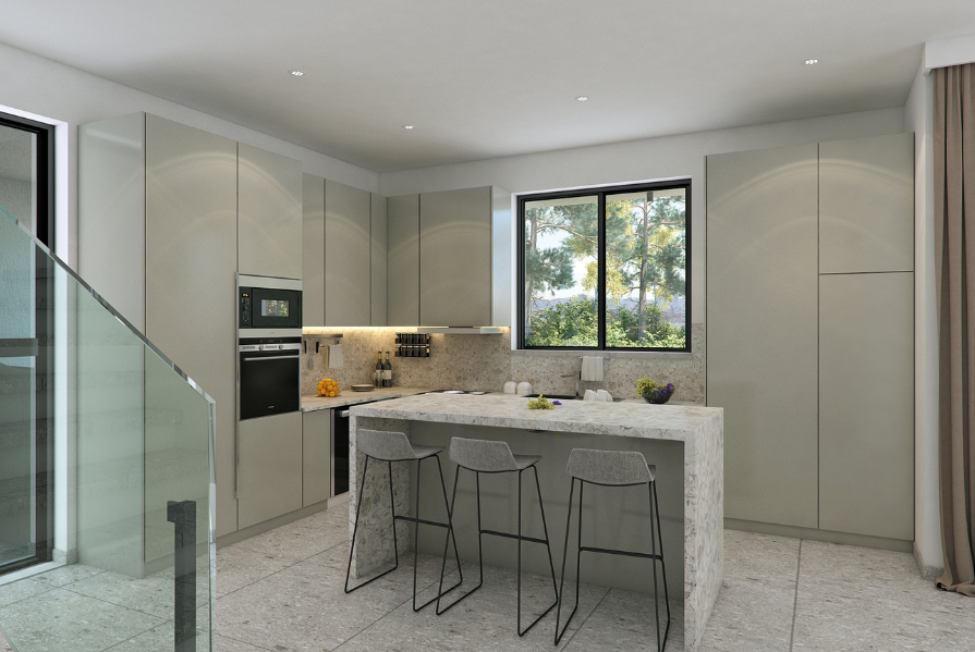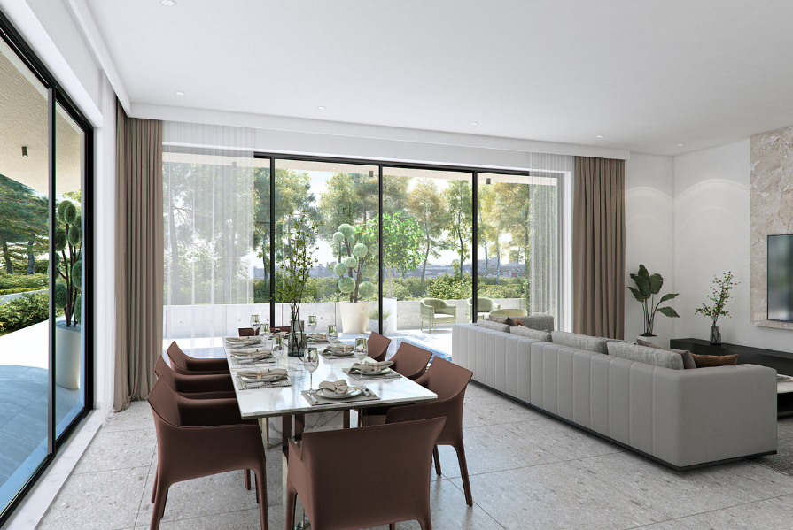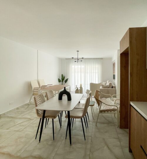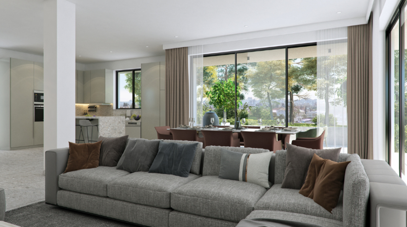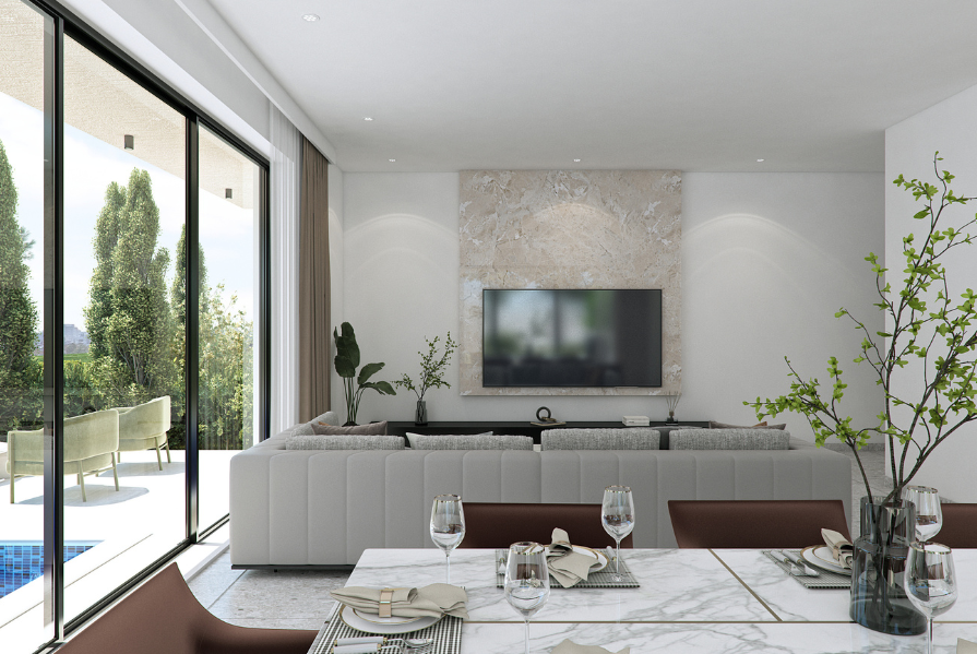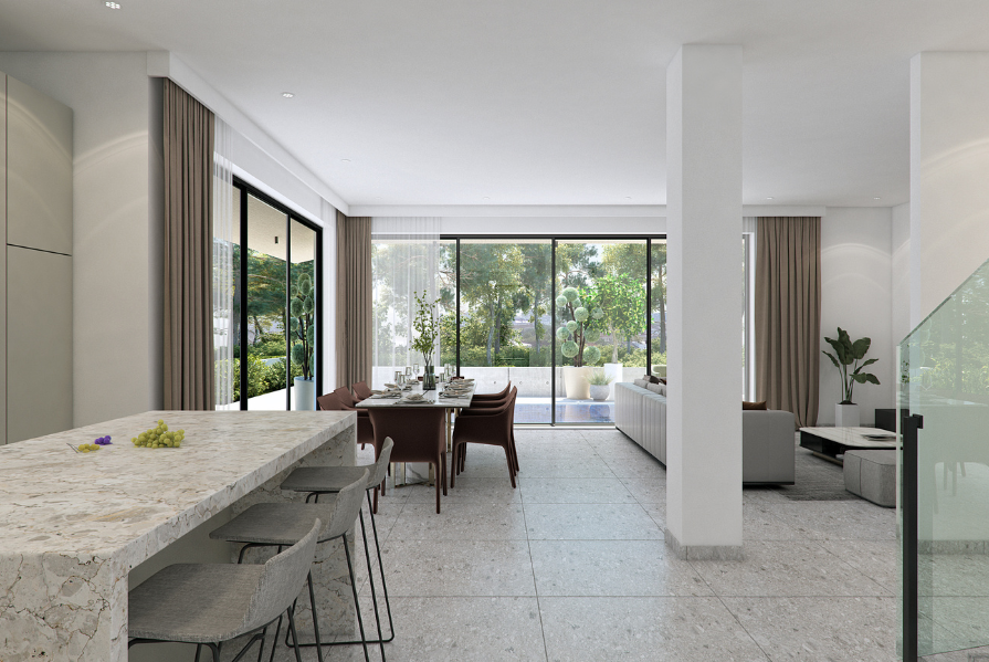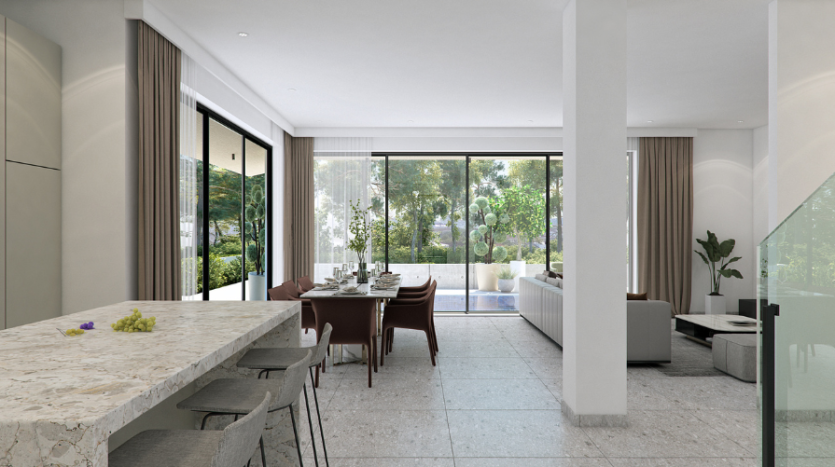 Upon entry, you are welcomed into a bright open-plan space connecting the living, dining, and kitchen areas, creating a comfortable and modern layout. A guest WC is located on the ground floor. From the kitchen area, there is direct access to a private covered garage, while doors from the living room open onto the outdoor space, enhancing indoor–outdoor living.