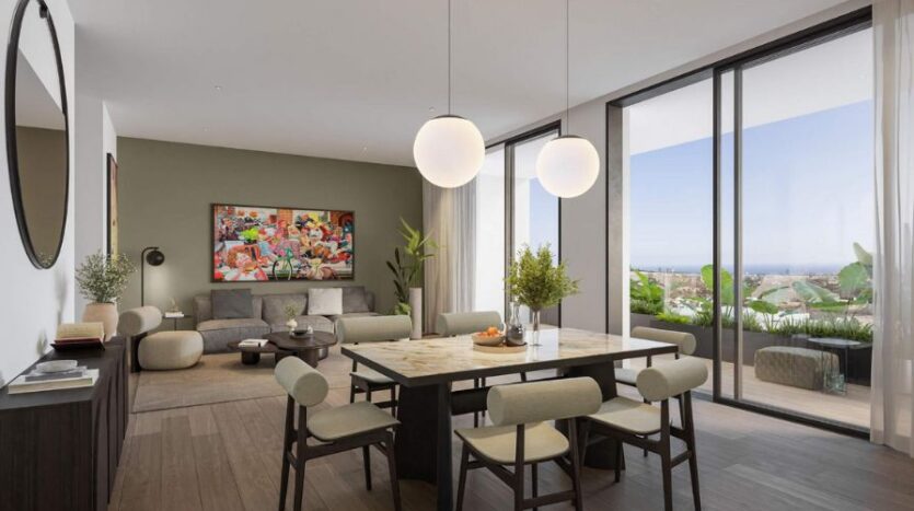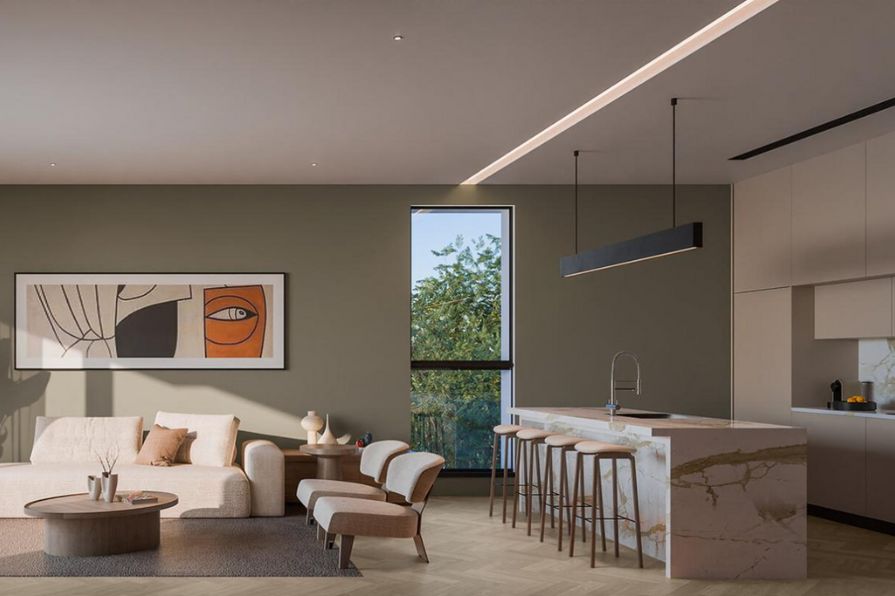 The open-plan layout seamlessly connects the living and dining areas to a stylish kitchen, complete with a contemporary island that provides additional workspace and a central spot for casual dining. Large sliding doors open onto a private balcony, creating a bright and airy atmosphere ideal for both relaxing and entertaining.