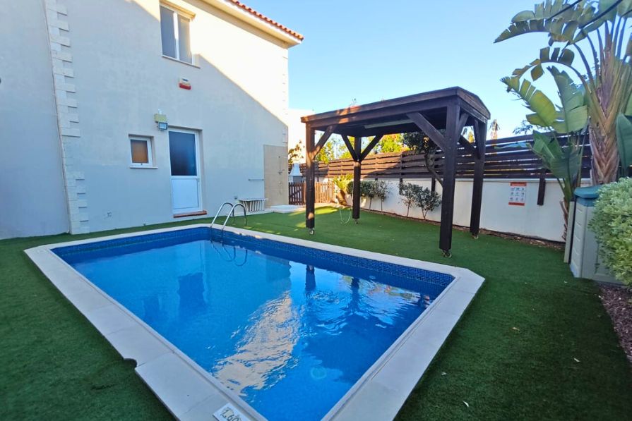 Stepping outside, the villa truly shines with its stunning private swimming pool, surrounded by a beautifully maintained patio area—perfect for sunbathing, outdoor dining, or simply unwinding in the warm Mediterranean climate.