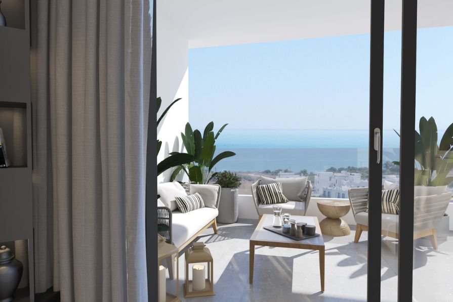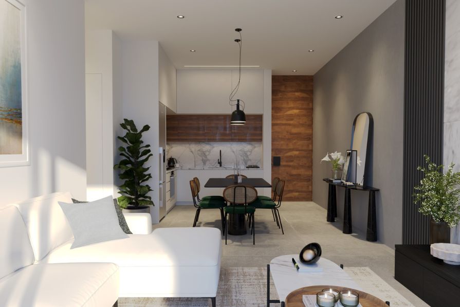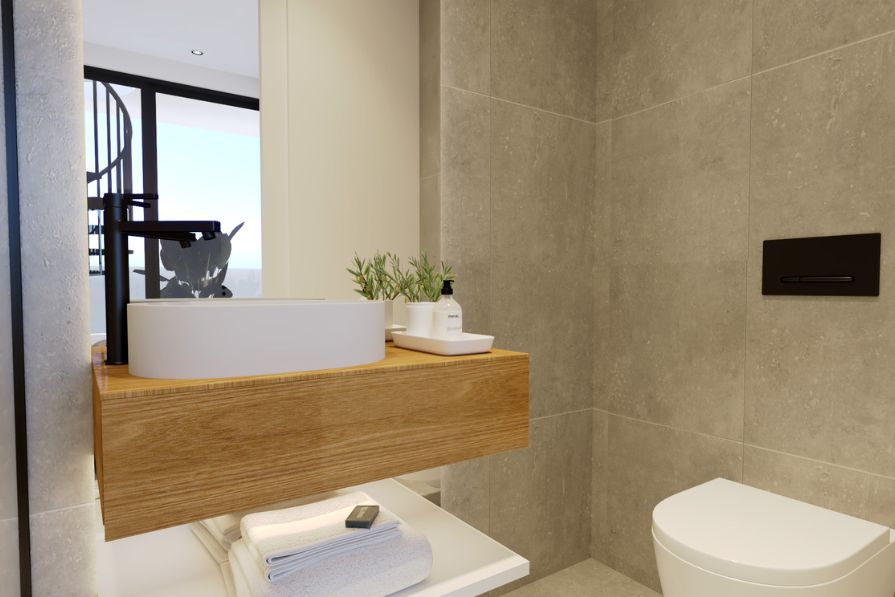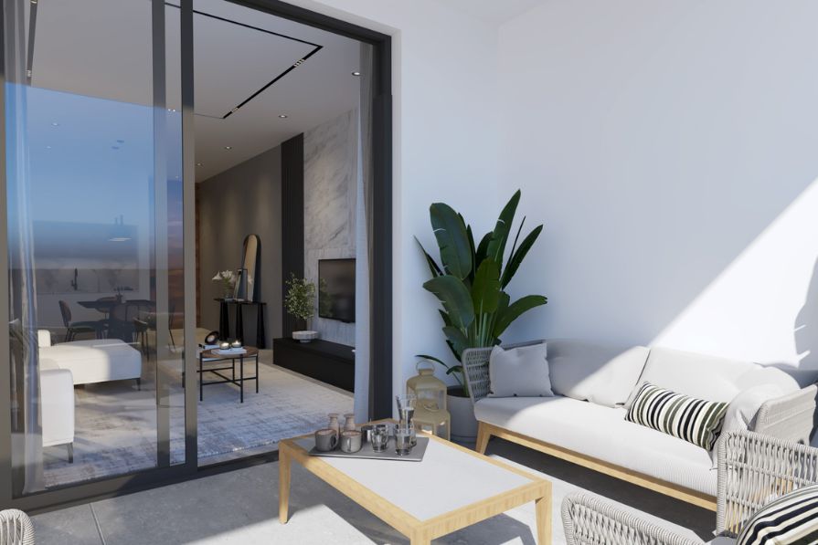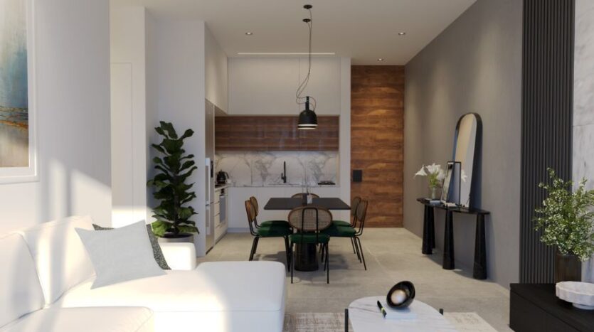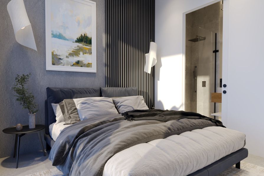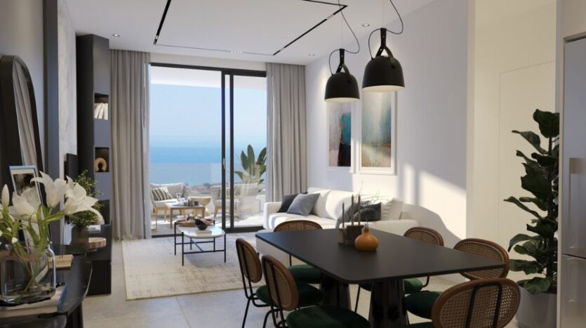 Seamlessly blending comfort, accessibility and eco-conscious living whilst offering open-plan living and stylish interiors, this apartment is certainly remarkable. The kitchen is constructed with modern, sleek units and worktops, whilst the dining area is spacious and leads through to the living area. The living area looks out to the communal pool – a wonderful spot to enjoy your morning coffee.