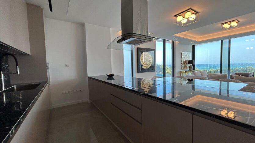 Upon entry, you are welcomed into a spacious open-plan area connecting the living, dining, and kitchen spaces. From the living area, large folding sliding doors open fully, creating a seamless transition to the outdoor area and maximizing the stunning sea views. A guest WC is also located on the ground floor.