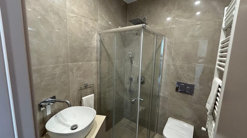 Upstairs, all three bedrooms are finished to a high standard, each benefiting from en suite bathrooms and private balconies with breathtaking sea views. The villa also features a 96 m² basement, which includes a private fully equipped gym and sauna, a wine cellar, and a separate laundry room. An elevator provides easy access to all levels of the property.