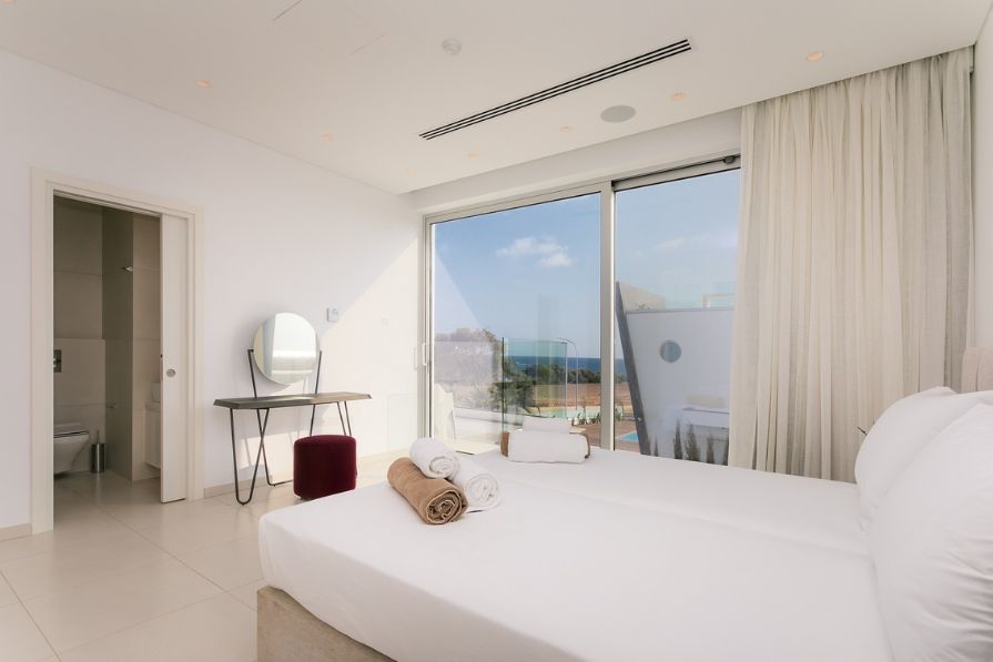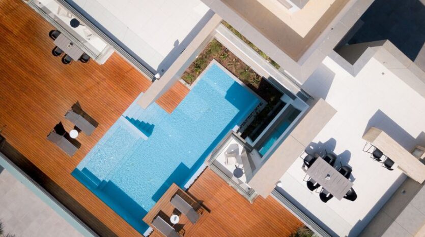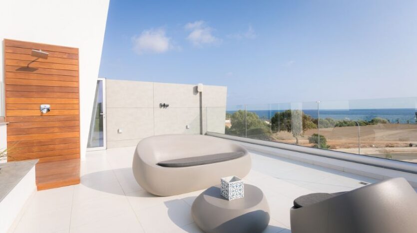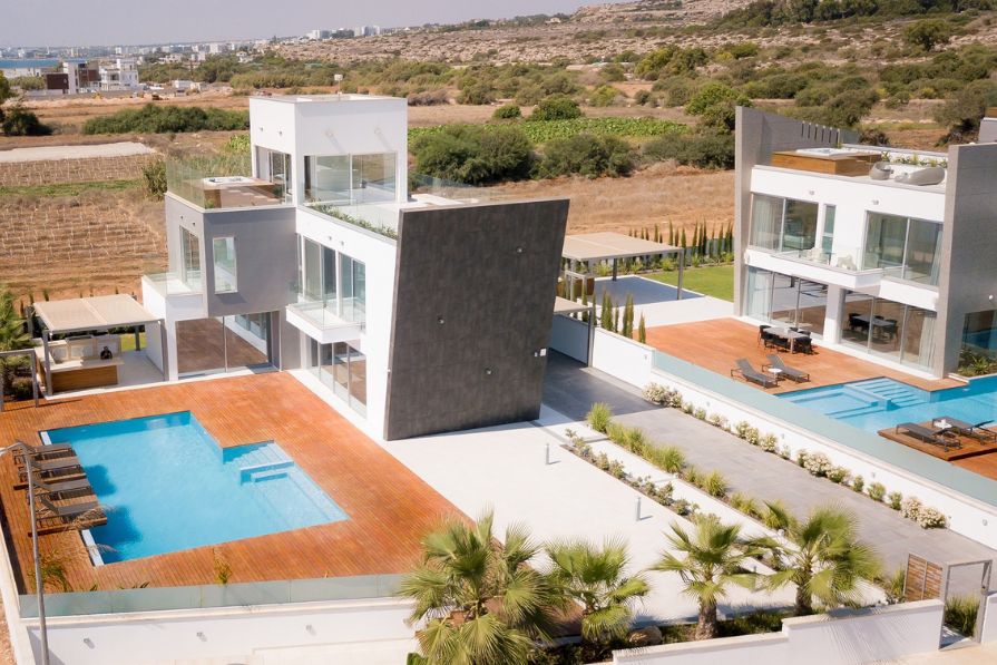 Impressive three-bedroom, five-bathroom detached villa boasting a private swimming pool, roof garden, hot tub and stunning sea views, set in one of the most picturesque coastal settings between Ayia Napa and Cape Greco. The exclusive development of just six homes, each with vast, unique plots, is just 150m from the sea and only seven minutes by car to Ayia Napa centre.