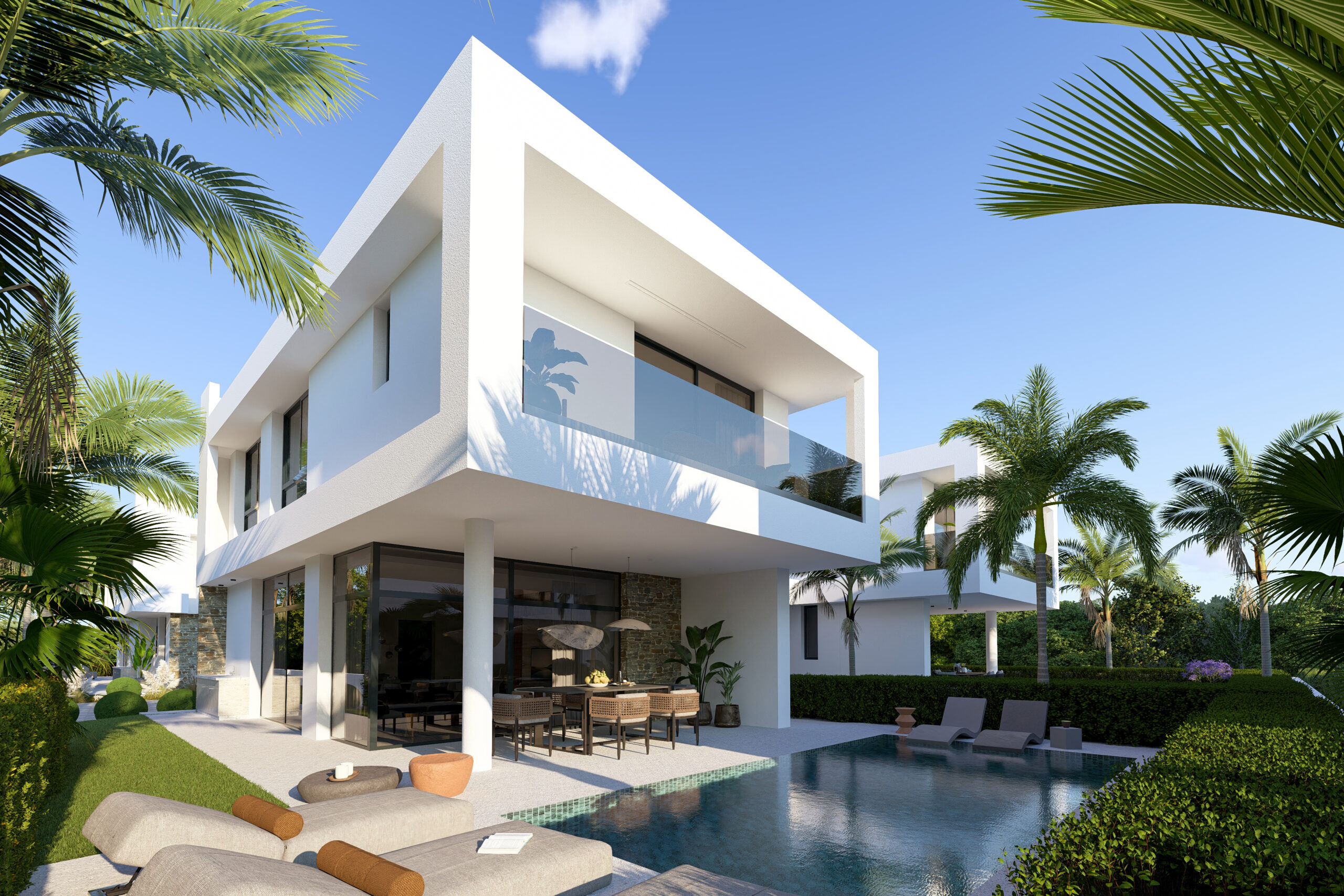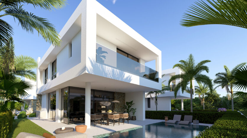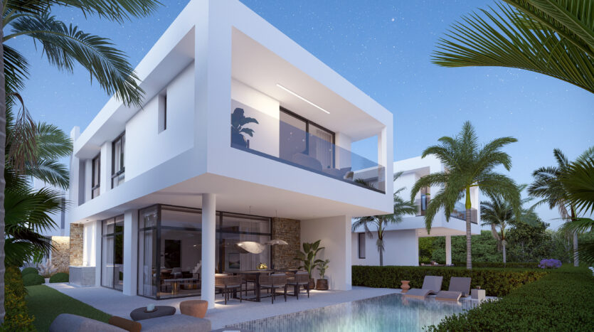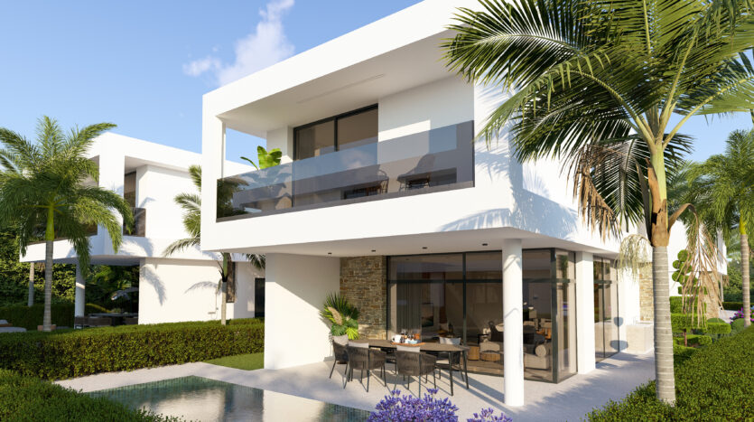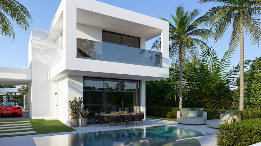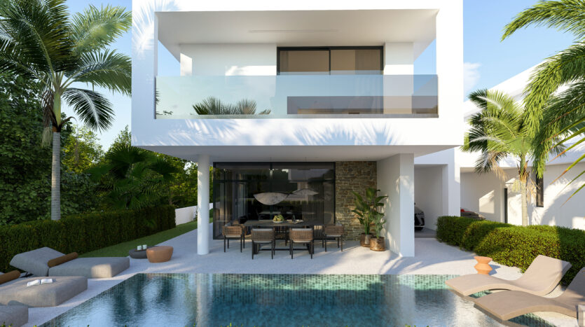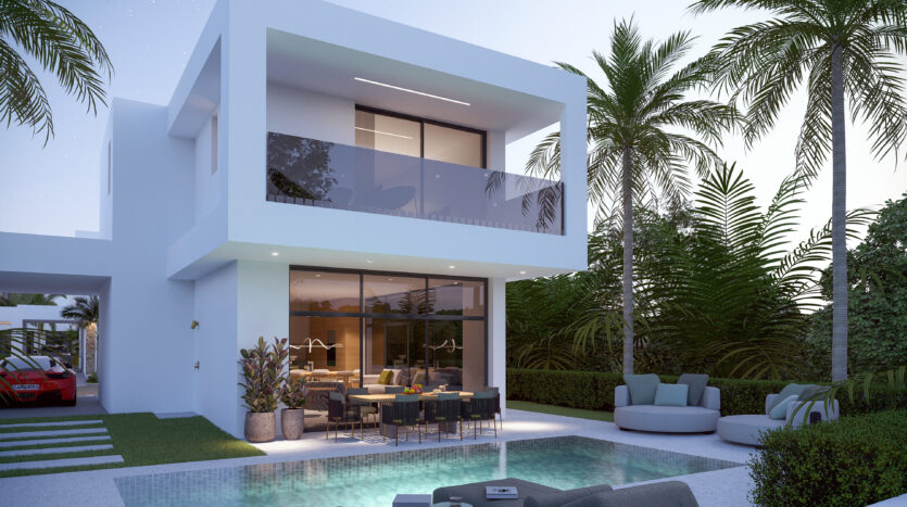 Set on an exclusive complex of just 12 villas, this property boasts a unique modern design and embodies elegance and luxury. The open plan design of the ground floor offers a modern kitchen and smart living and dining areas which lead out to the private garden with easy pool access. There is also a guest WC on the ground floor for your convenience.
