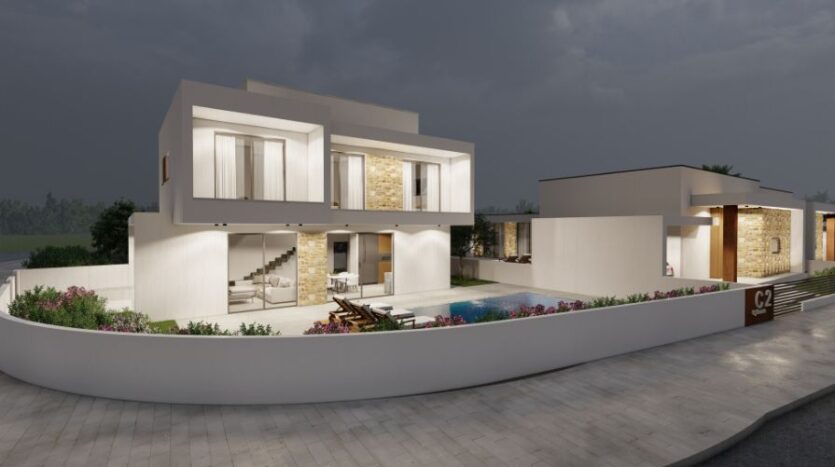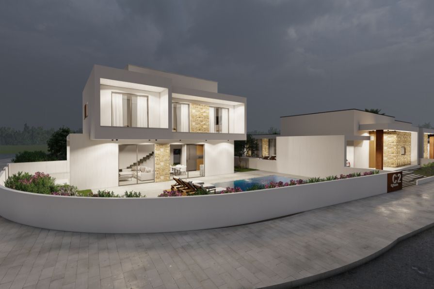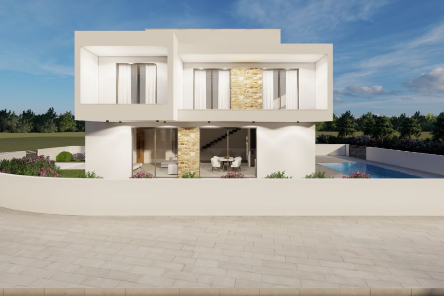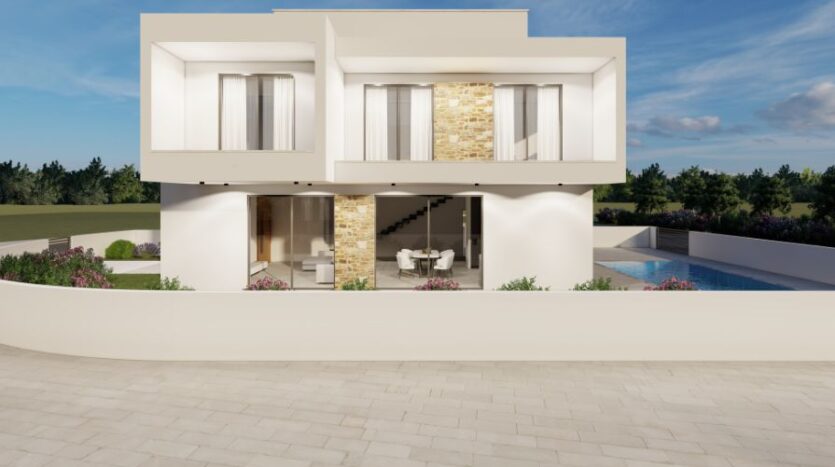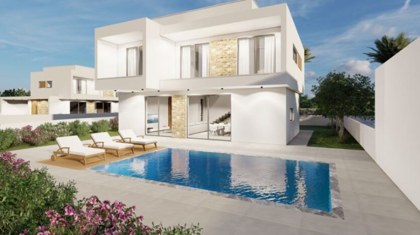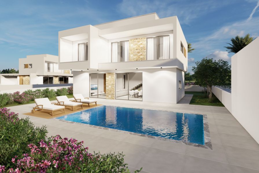 Impressive three-bedroom modern villa with an optional private swimming pool, in the quiet village of Xylofagou. Just a three-minute drive brings you to the centre of the village where you can find all amenities including shops, restaurants and bakeries, and the stunning Siren’s Beach in nearby Ayia Thekla can be reached in just twelve minutes. The luxury Ayia Napa Marina is also twelve minutes by car and Ayia Napa centre is seventeen minutes.