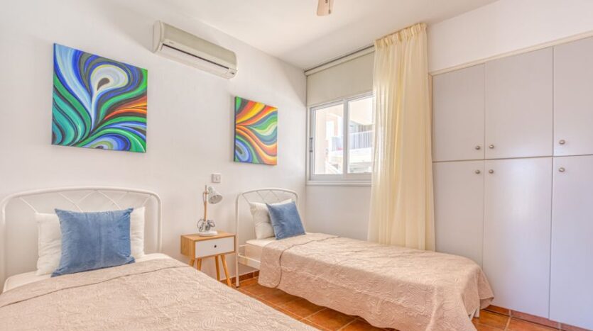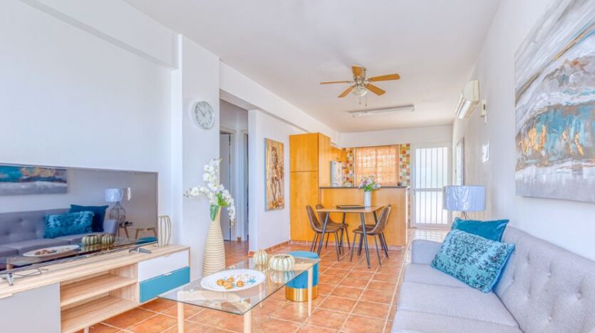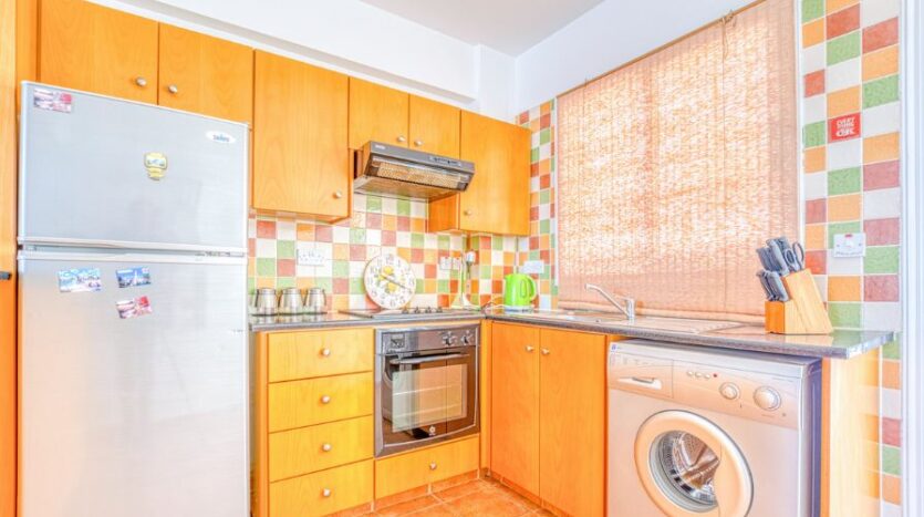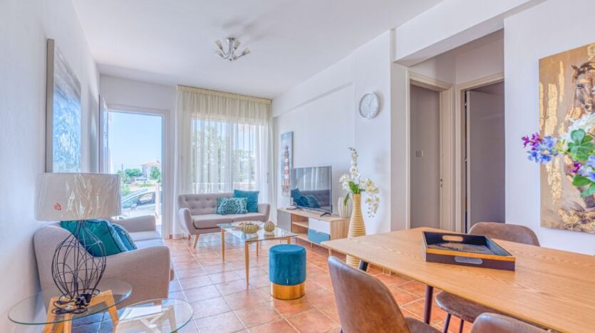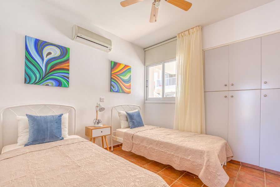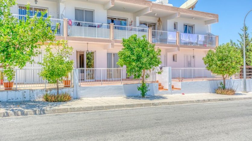 Inviting two bedroom ground floor apartment with Title Deeds and a communal swimming pool, located in Paralimni. The centre of Paralimni can be reached in less than eight minutes by foot, whilst the nearby areas of Dernyeia and Kapparis are approximately a nine-minute drive.
