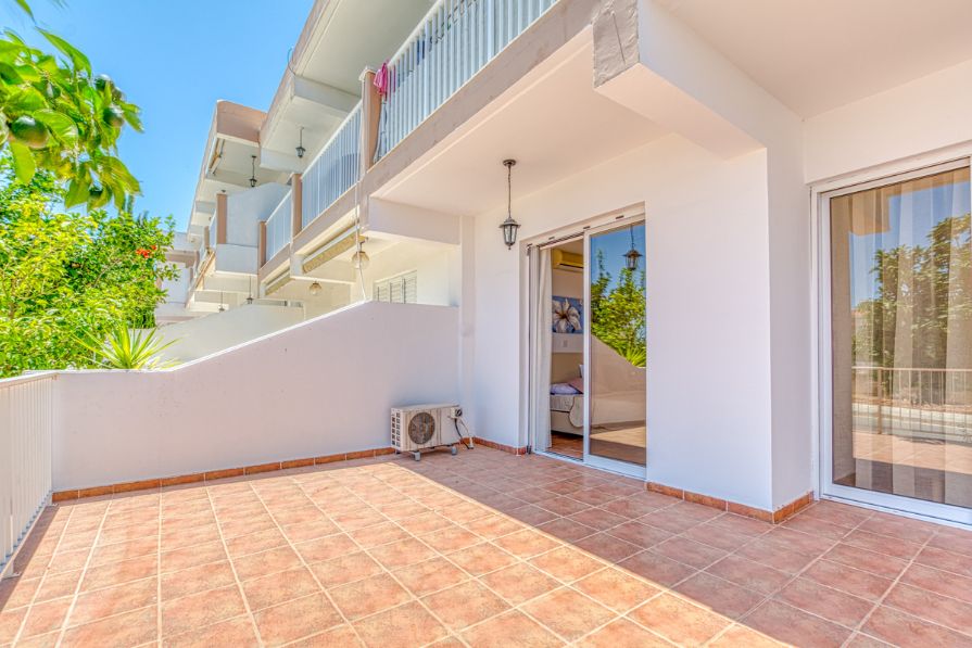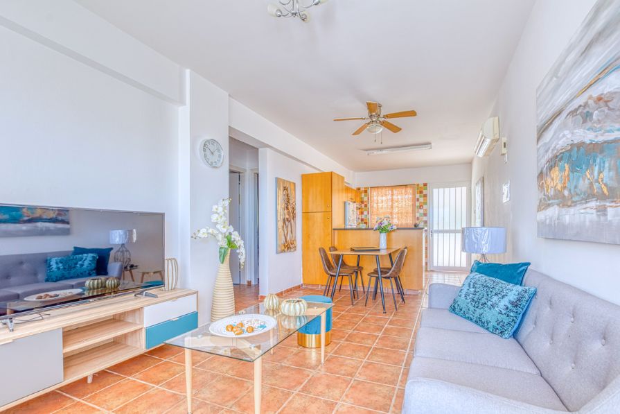 The apartment features an open-plan design, creating a spacious and airy living, dining, and kitchen area. The fully fitted kitchen is perfect for everyday convenience, while the living room opens onto a large front patio, offering lovely views of the sea and the surrounding area—ideal for outdoor dining or relaxing.
