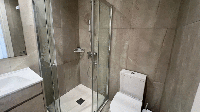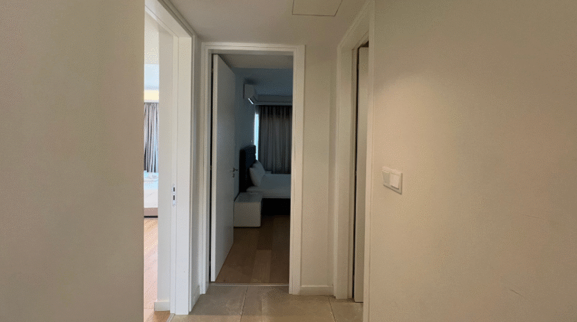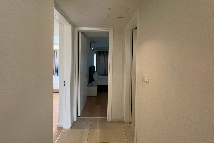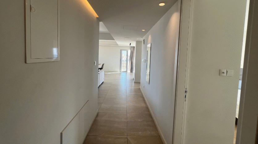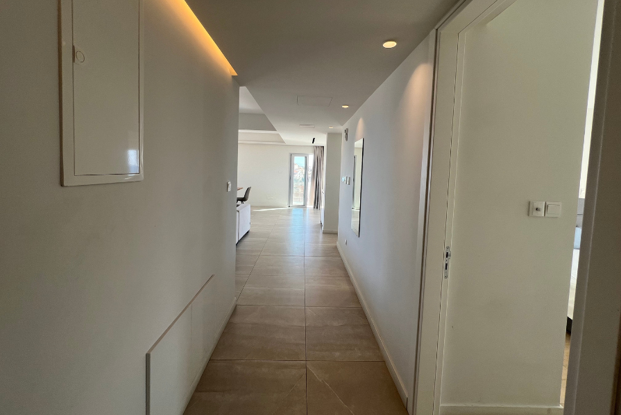 Positioned on the second floor, the apartment welcomes you with a long corridor that separates the private bedroom wing from the main living areas, ensuring comfort and privacy. The property features three spacious bedrooms, all with fitted wardrobes.