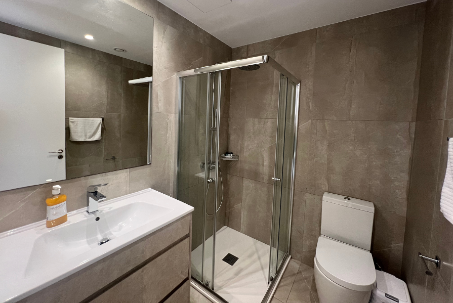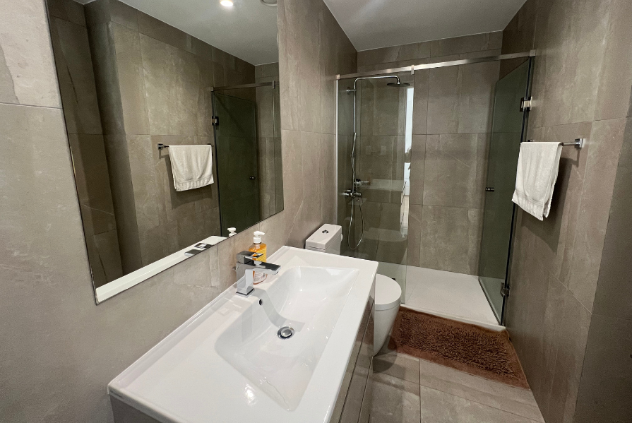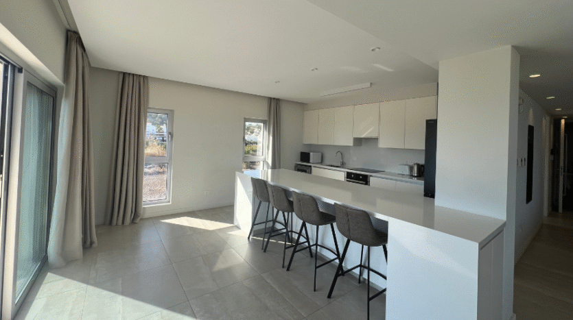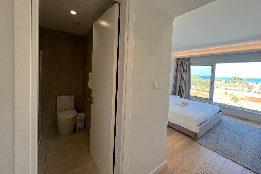The main bedroom includes an en suite with a shower and large windows that frame beautiful sea views. The second bedroom has access to the main bathroom with a shower, along with large windows and a sliding door that leads directly to the balcony. The third bedroom features its own en suite with a shower and two windows that fill the room with natural light while offering inland views.