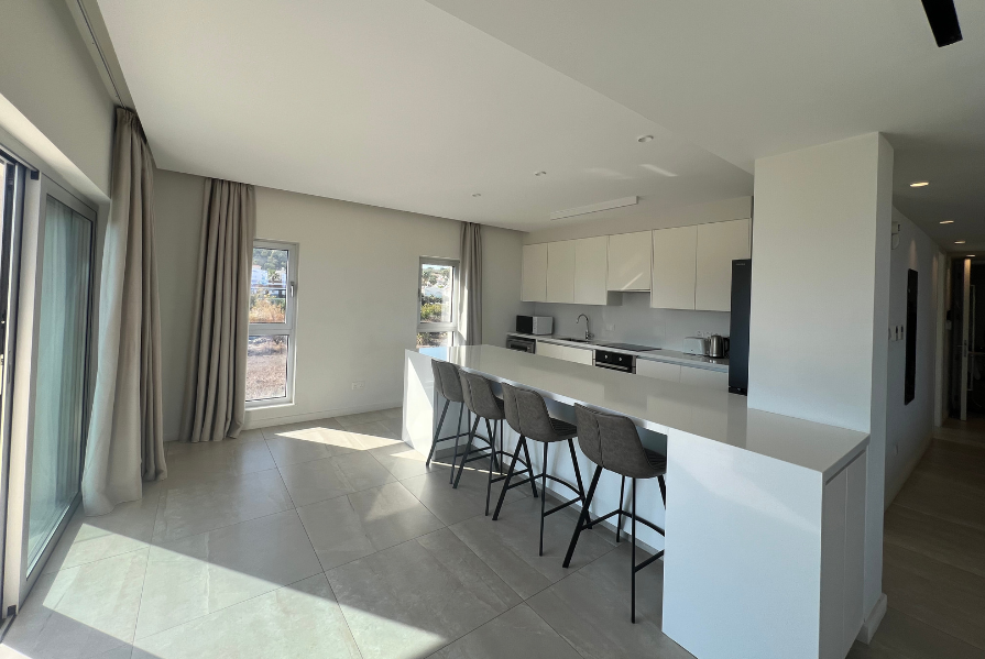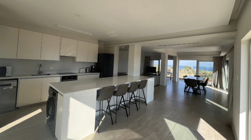 The corridor leads to a bright and expansive open-plan layout connecting the living, dining, and kitchen areas. Large sliding doors open from all three spaces onto the wraparound balcony, where you can enjoy stunning panoramic views of the sea and the communal pool.