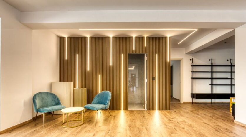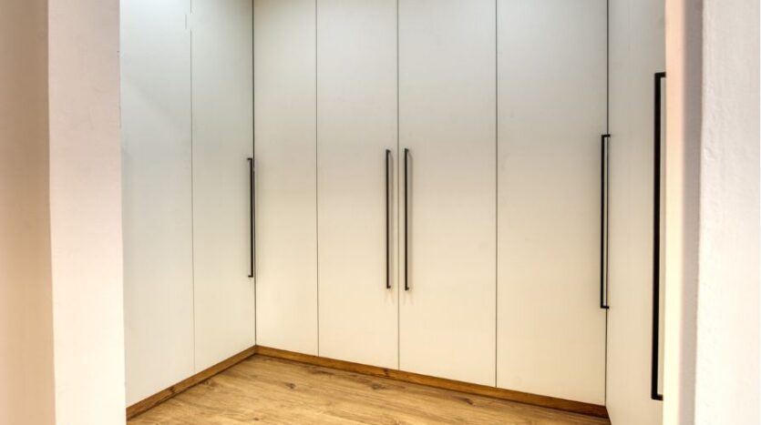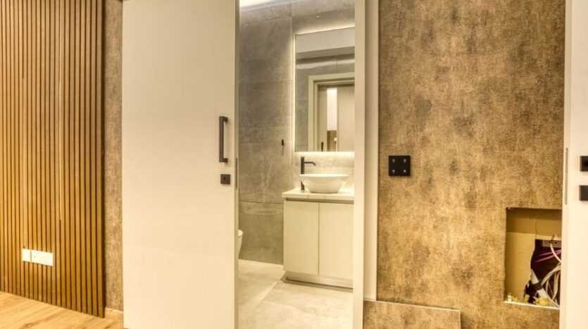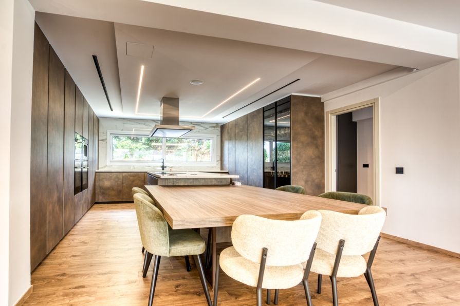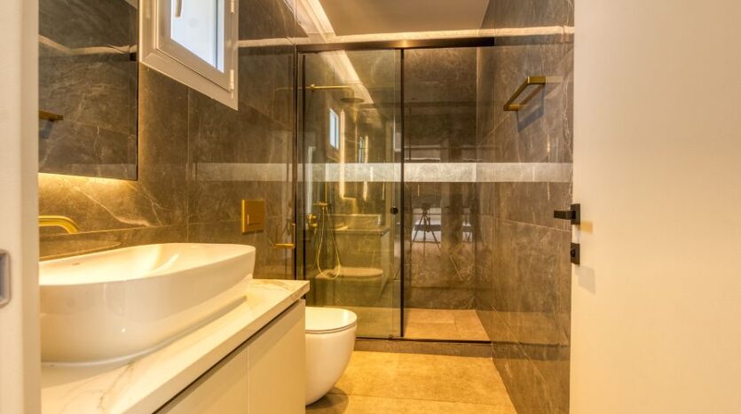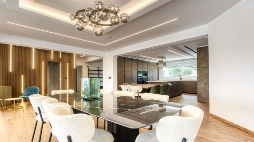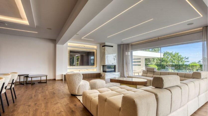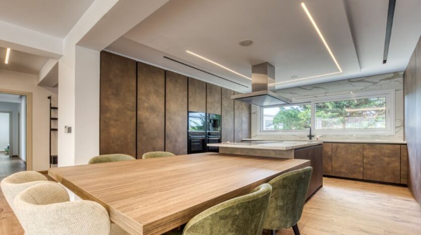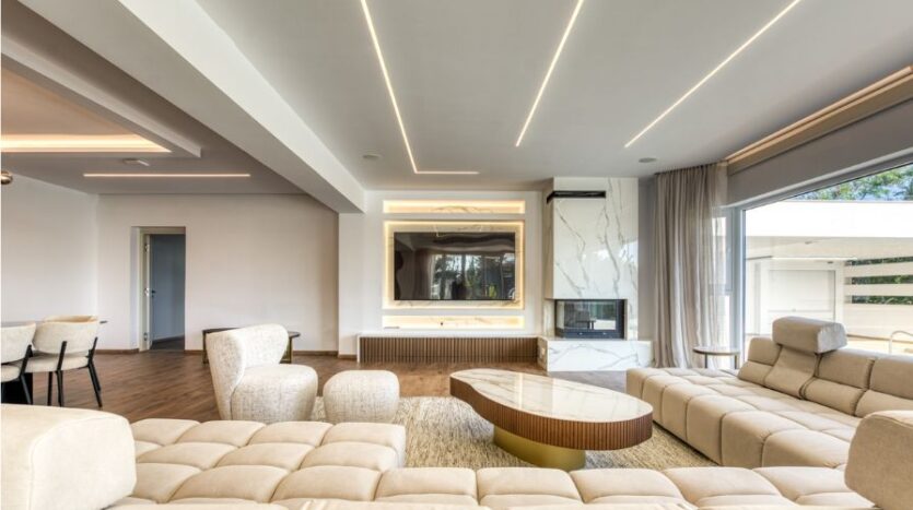 Inside, the villa is fully furnished with high-end, luxurious furnishings that complement its elegant and modern design. The open-plan living areas are warm and welcoming, centered around a feature fireplace that adds charm and comfort. The fully fitted kitchen is a chef’s dream, offering generous counter space, high-quality appliances and a central island ideal for both cooking and casual dining.