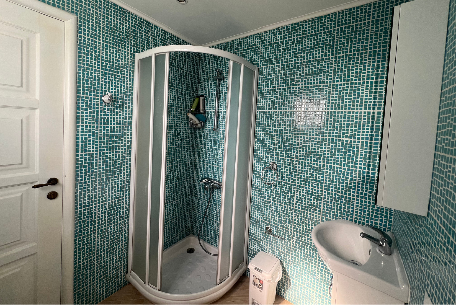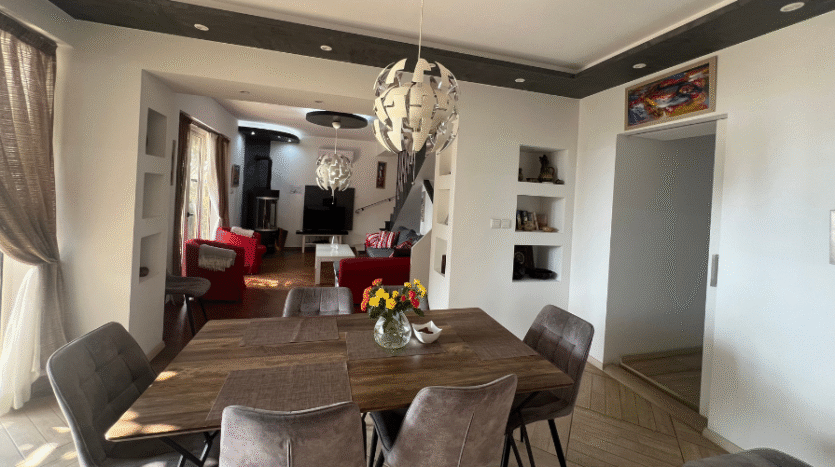 Upon entering, you step into a bright and open-plan space that connects the living, dining, and kitchen areas. Tall glass doors fill the home with natural light and open directly onto the outdoor area and backyard, blending indoor and outdoor living beautifully. The ground floor also includes a guest WC and additional storage rooms for convenience.