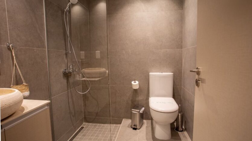 Upstairs, the first floor is dedicated to three generously proportioned bedrooms, each with its own contemporary ensuite shower room. Every bedroom features floor-to-ceiling windows that maximize natural light and ensure the stunning sea views are a constant presence. Waking up to the horizon stretching across the Mediterranean is a daily luxury that defines this home.