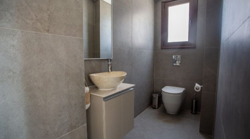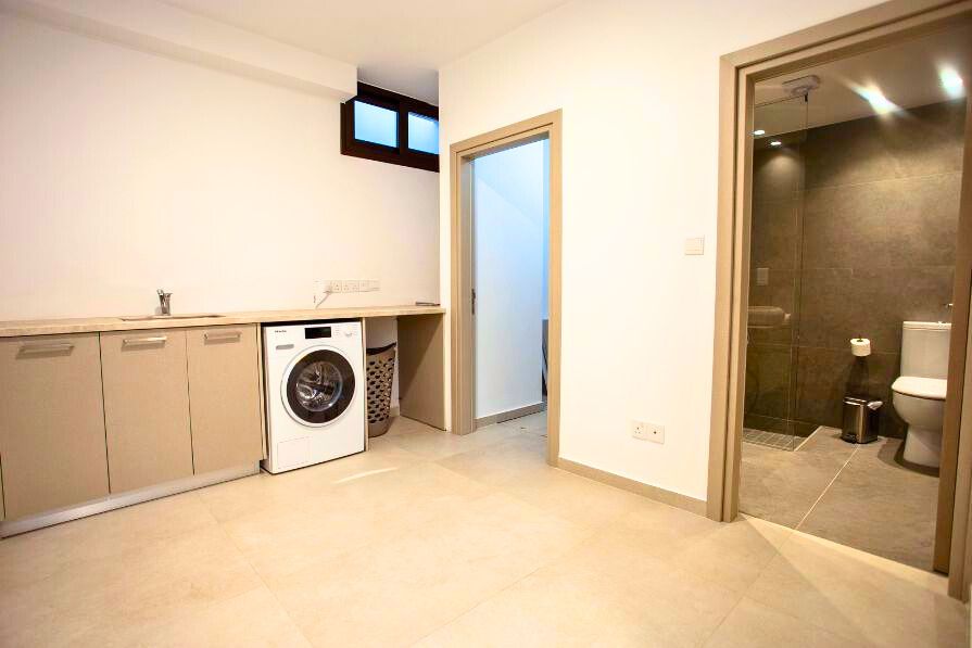 The villa is arranged over four thoughtfully designed floors and showcases a light-filled open plan layout. The main living area is bathed in natural light through floor-to-ceiling glass doors, framing views of the private garden, infinity-edge swimming pool and the vast expanse of the Mediterranean Sea beyond. The space flows seamlessly into the dining area, which is positioned adjacent to a beautifully appointed kitchen. The kitchen features modern fixtures, soft-close cabinetry and an abundance of countertop space, making it both functional and visually striking. The ground floor is completed by a stylish guest WC, adding convenience for residents and visitors alike.