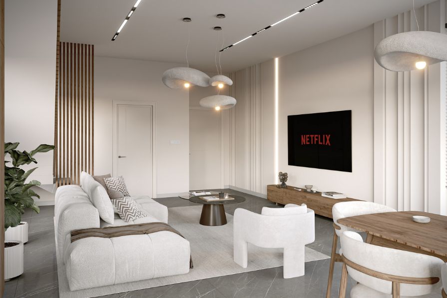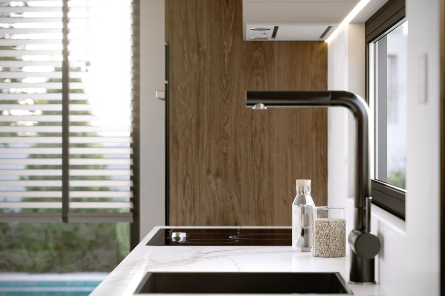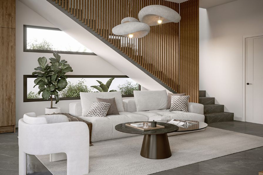 The ground floor of the property is open plan, allowing an abundance of natural light to stream through the floor-to-ceiling glass sliding doors and windows, creating a welcoming and relaxing atmosphere. The living room is spacious and comfortable and the modern kitchen connects with the dining area which looks out to the private pool. The ground floor also benefits from a guest WC for added comfort and convenience.