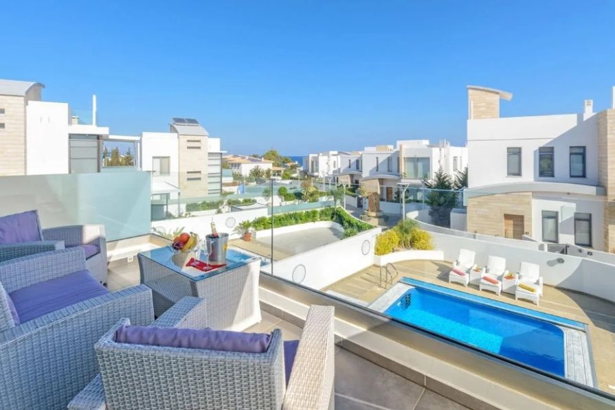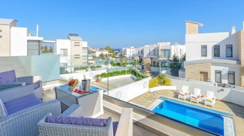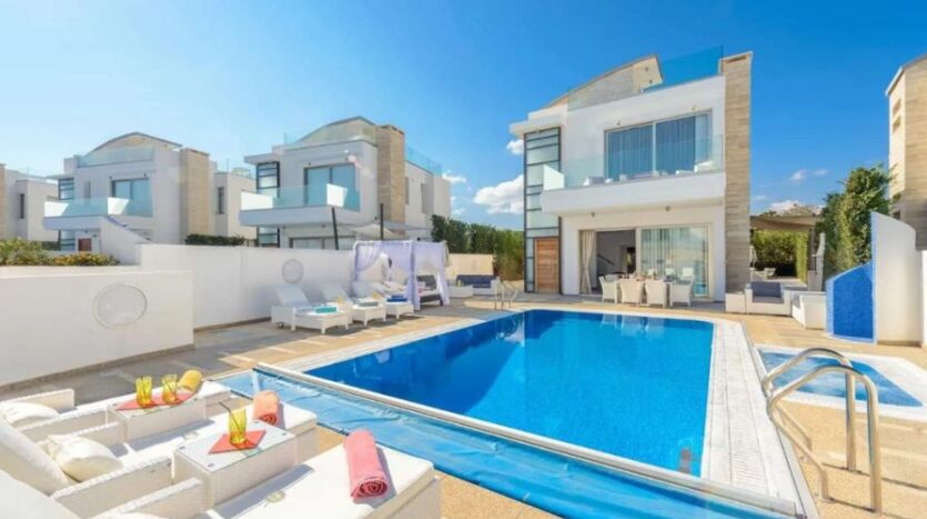 This luxurious six-bedroom villa in Protaras presents an exceptional blend of comfort, style and modern amenities making it the perfect choice for both year-round living and as a high-end vacation rental. Just steps from the beach, offering direct access to Protaras’ golden sands, while being within walking distance of the vibrant town center with shops, restaurants, bars and supermarkets. Ensures security, privacy and a serene living environment within a well-maintained beachfront complex.