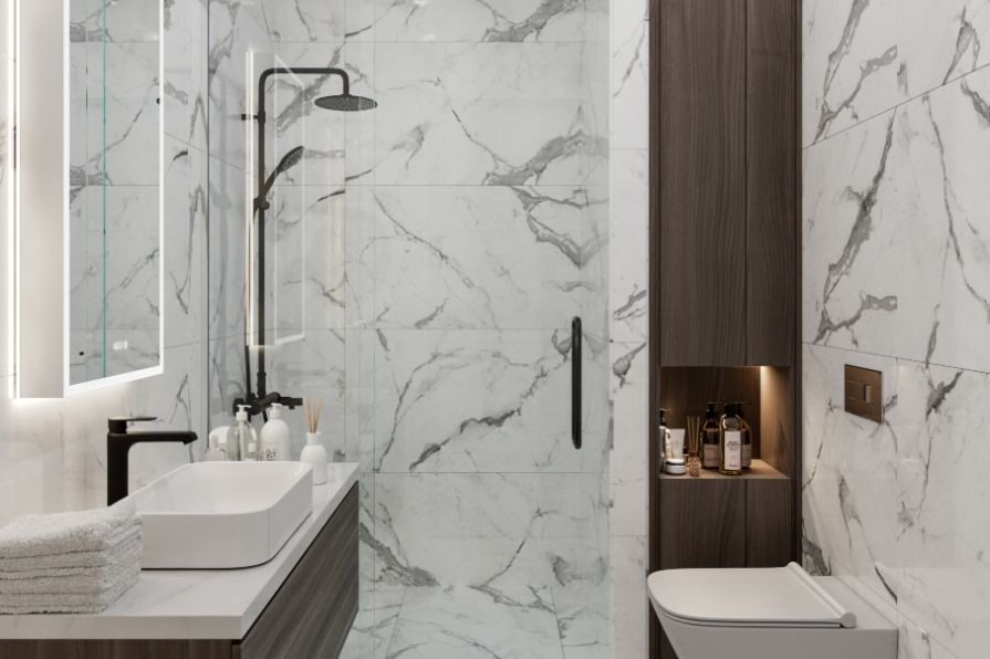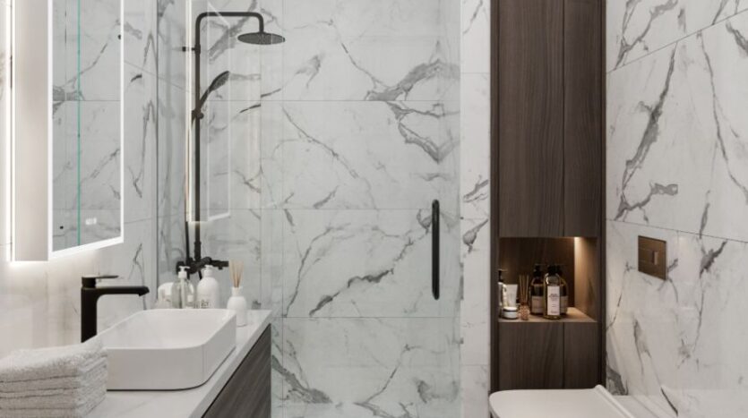 All three bedrooms are well-proportioned and include fitted wardrobes, with one bedroom benefiting from a private en-suite shower. A main bathroom serves the rest of the apartment, while a separate guest toilet adds extra convenience for residents and visitors.