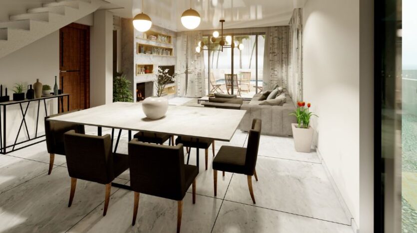 The open plan design creates a modern and bright feel throughout, with large windows and glass sliding doors allowing plenty of natural light to spread through the property. The kitchen is modern with high quality units and countertops, ensuring plenty of worktop and storage space. The dining area is conveniently located next to the kitchen and leads through to the living area which looks out to the private garden and pool area. The ground floor also benefits from a guest WC for added convenience.