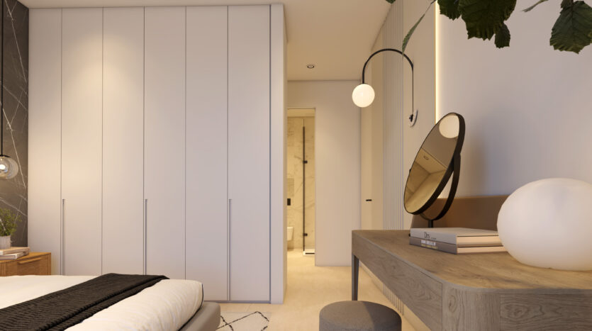 Inside, the apartment features an open-plan layout with a central kitchen and dining area, guest WC, and en-suite shower. Both bedrooms include fitted wardrobes, while high ceilings and floor-to-ceiling windows fill the space with natural light and highlight the breathtaking sea views.