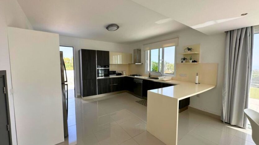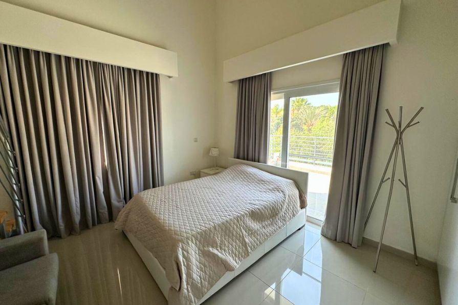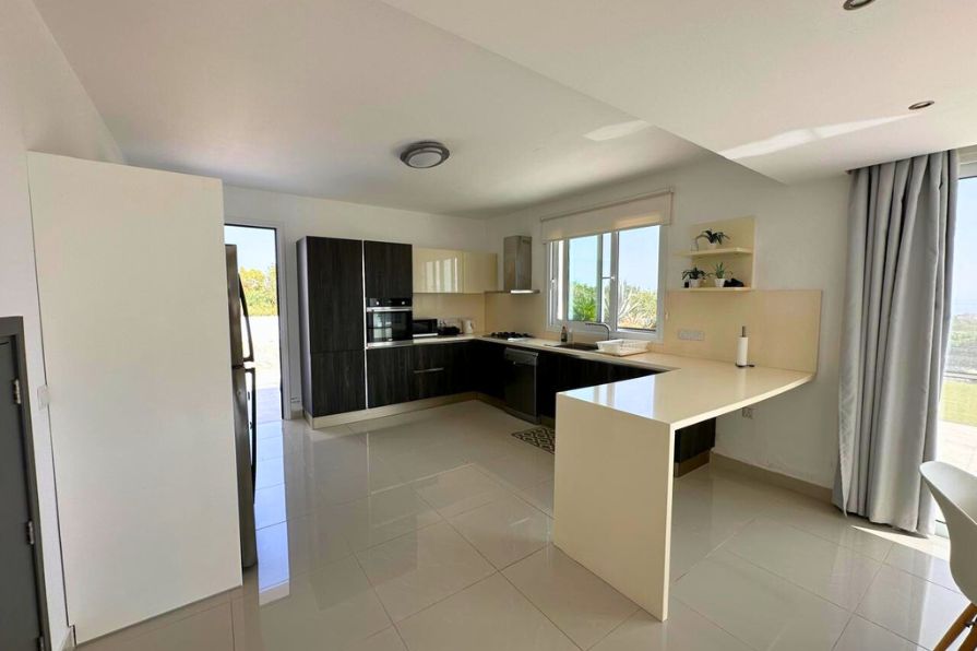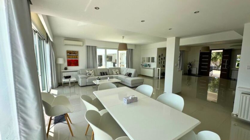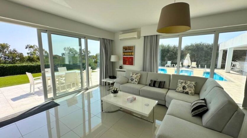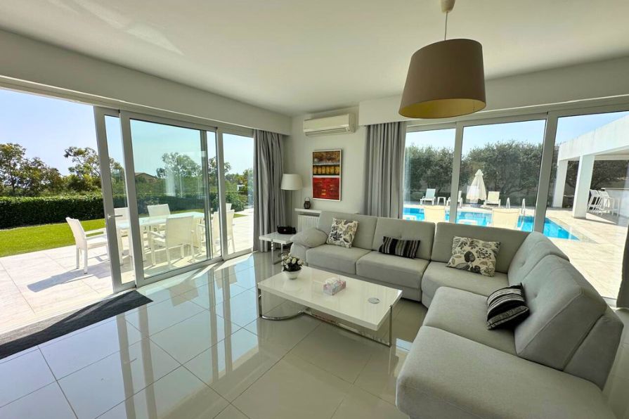 As you enter the villa, you’re greeted by a sense of space and calm. The interior unfolds into a flowing open-plan layout, where two generous lounge areas offer versatile zones for family gatherings or entertaining guests. One of the lounge spaces opens directly onto the pool terrace, creating a seamless transition between indoor comfort and outdoor relaxation. The palette is neutral and elegant, allowing the natural beauty of the surroundings to take center stage, while thoughtful furnishings and finishes enhance the sense of quiet luxury.