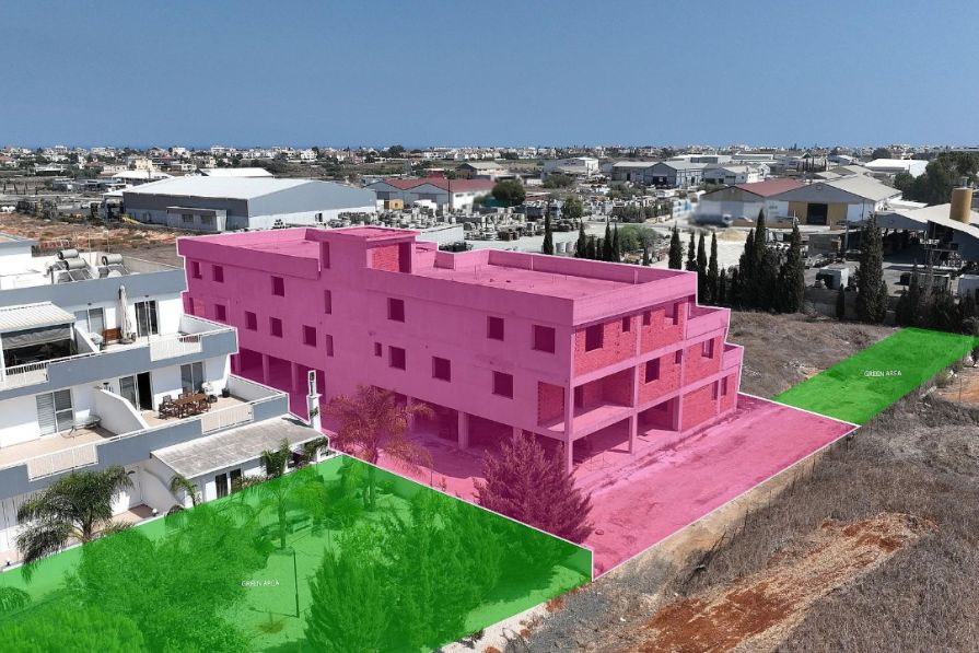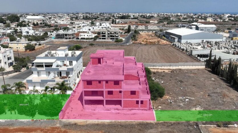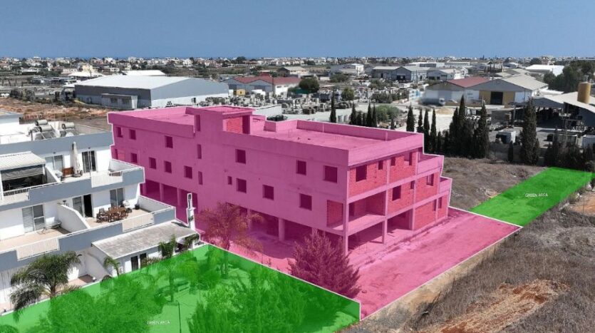 This incomplete property presents an exciting opportunity for further development, with independent rights and a separate title deed already secured. Accessible via a private road, the building includes parking and features four apartments on the ground floor, six apartments on the first floor and approved plans for four additional units on the second floor.