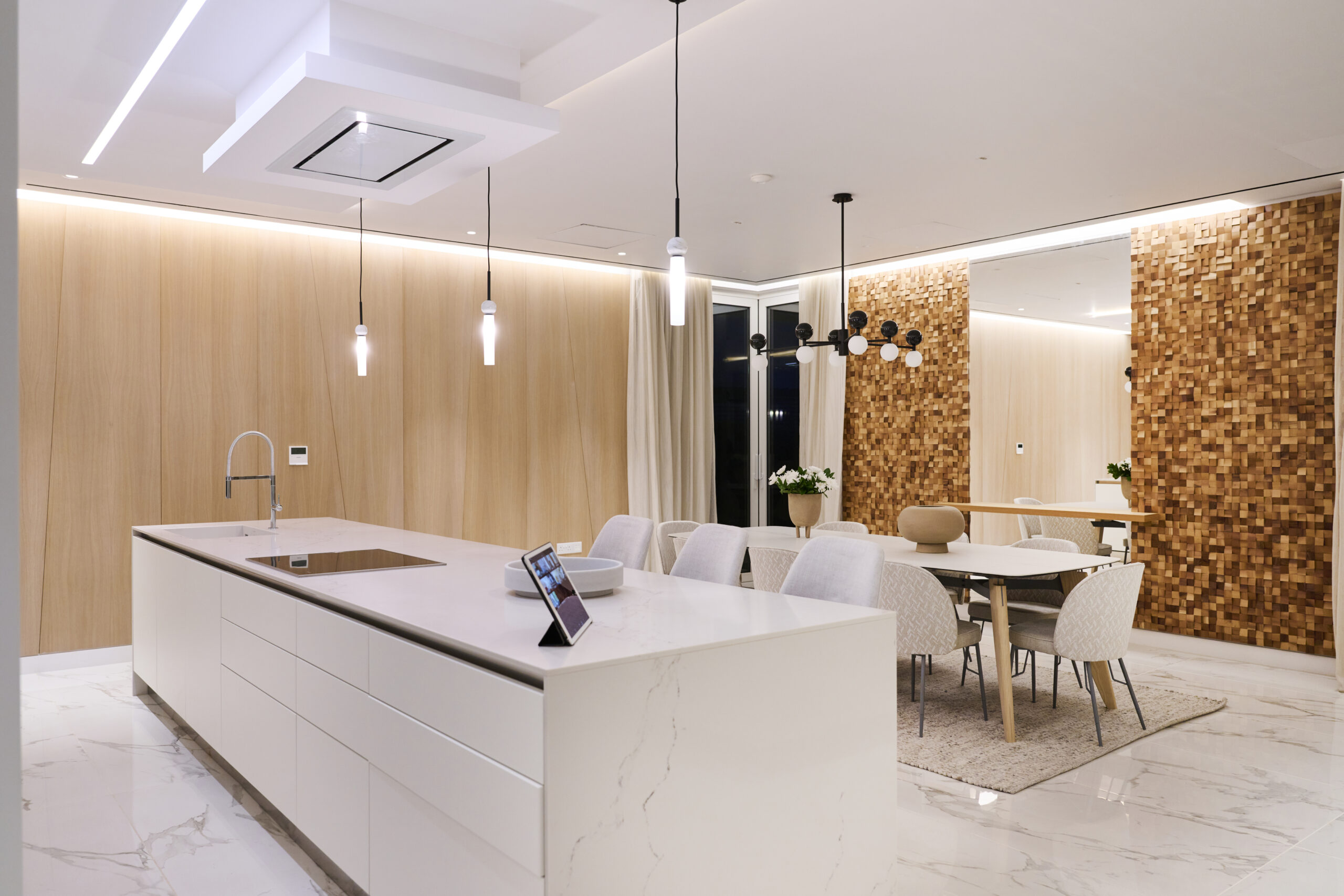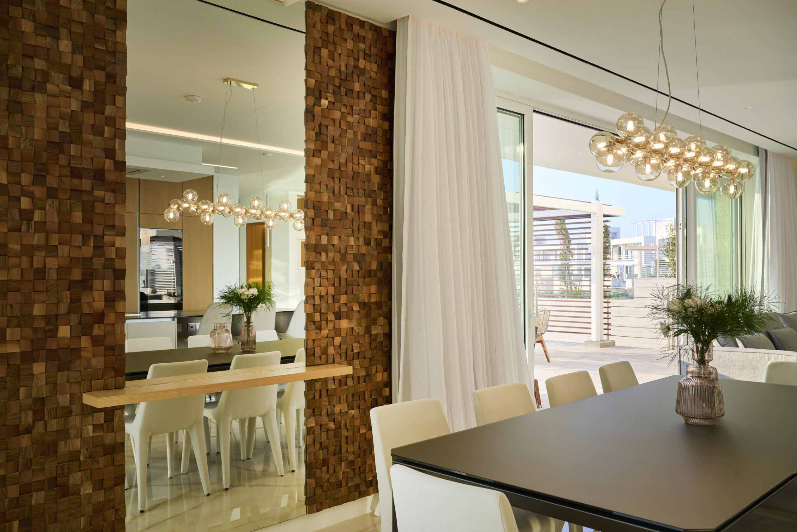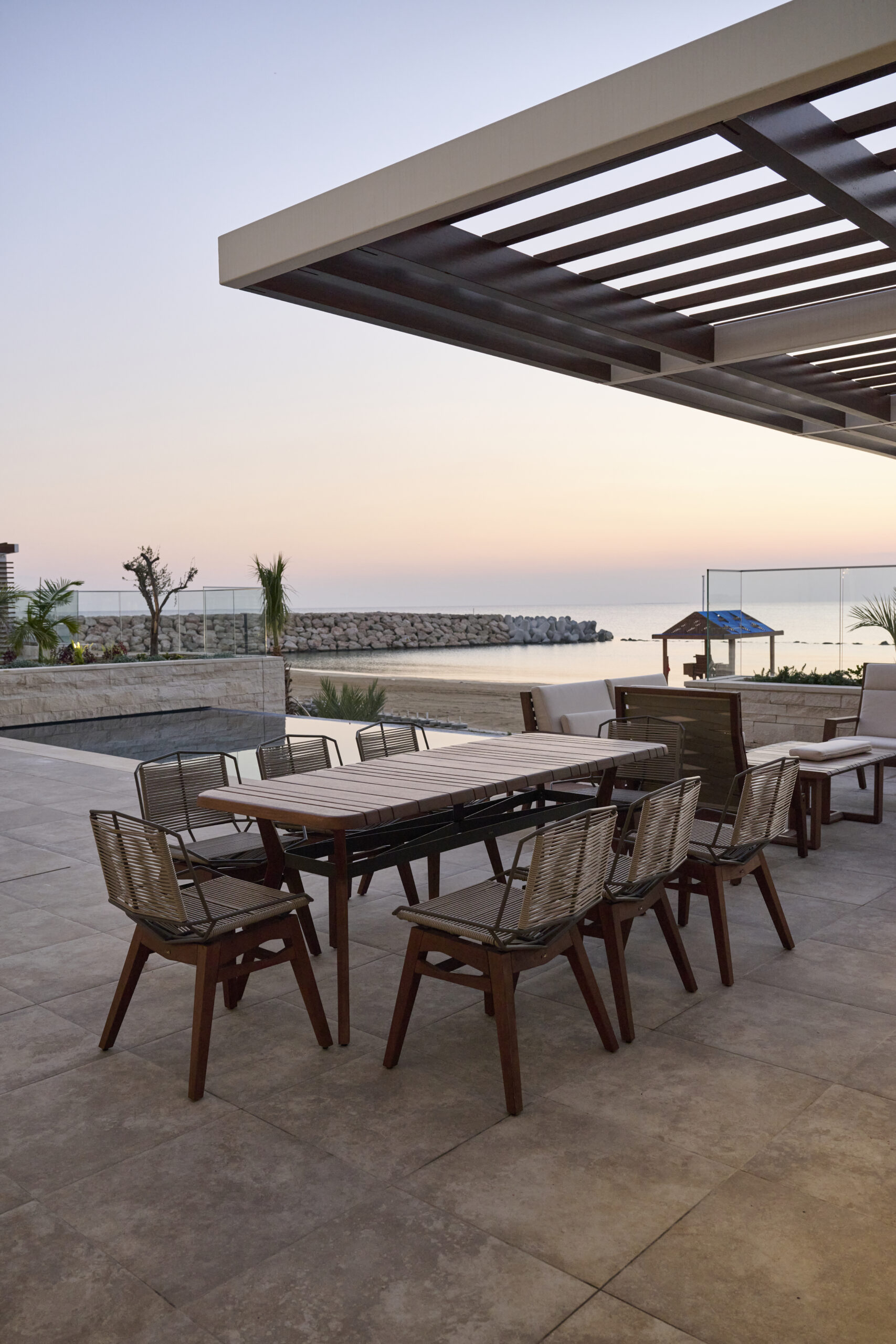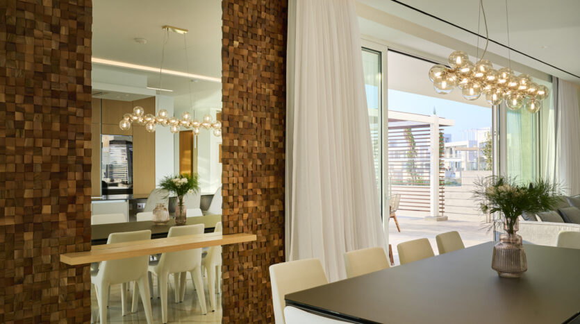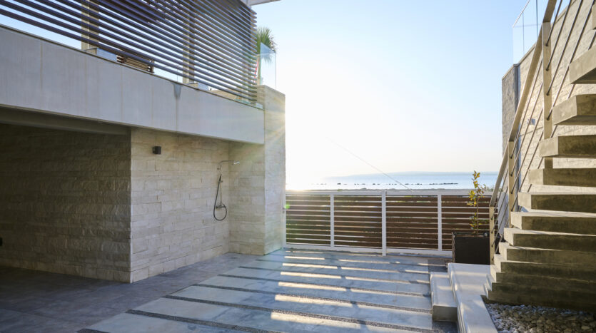 Inside, the open-concept living space is bathed in natural light, with high-end finishes throughout, blending with the polished marble floors and hardwood accents. The gourmet kitchen is outfitted with top-of-the-line appliances, a walk-in pantry and a large island perfect for entertaining. The living area is expansive with plush seating that faces the beach with huge sliding doors that connect the interior to an infinity pool, where the horizon seamlessly blends with the water creating an uninterrupted view of the sea. The ground floor also has a guest toilet.