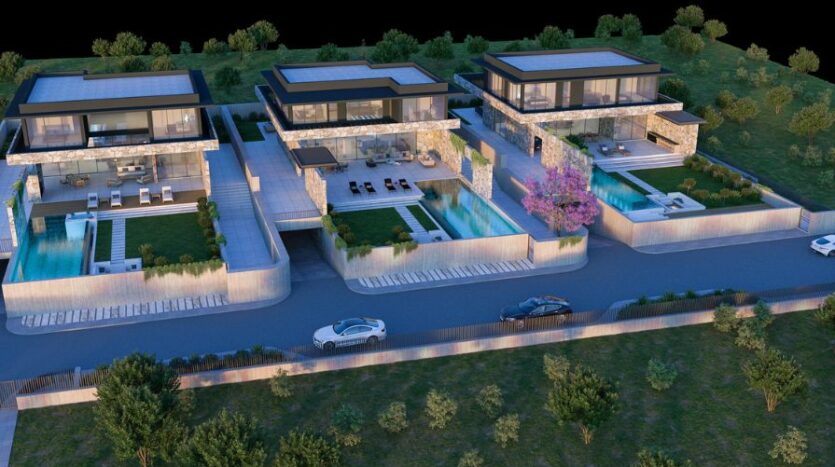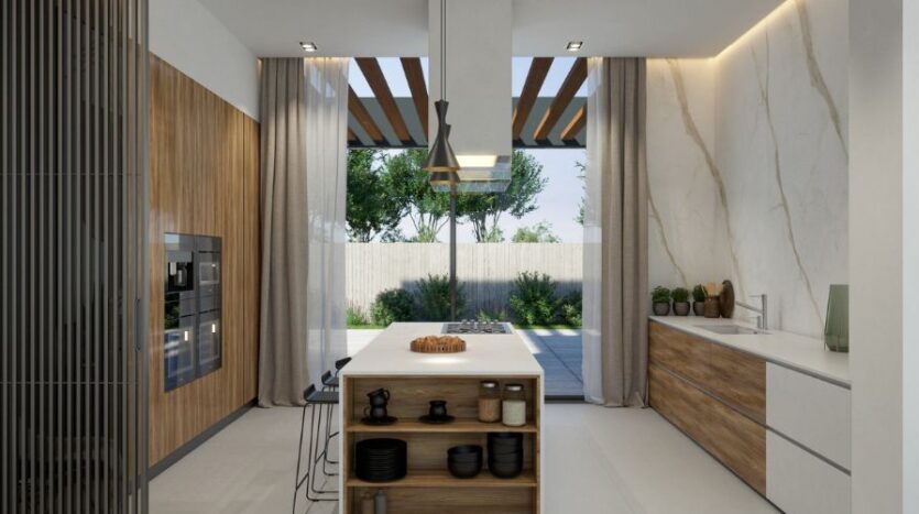 The five bedrooms follow a minimal design with fitted wardrobes for comfort and convenience. On the first floor, three bedrooms benefit from an ensuite bathroom with the fourth bedroom having full access to the main bathroom with a shower over the bath. The master bedroom boasts not only an ensuite bathroom but also a walk-in wardrobe which can be accessed from both the bedroom and landing area. Two of the bedrooms also have access to covered verandas with views of the nearby coastline – perfect for enjoying a quiet morning coffee or perhaps a cold glass of wine whilst watching one of Cyprus’ beautiful sunsets.