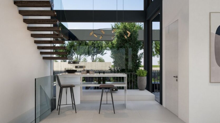 This exclusive three level villa has been cleverly designed to give unobstructed sea-views of the Mediterranean coast combined with views of the spacious landscaped gardens and natural surrounding areas. The stylish open plan living space and dining room, along with a semi open plan kitchen area, boasts floor to ceiling glass doors allowing an abundance of natural light to stream through the entire space, providing wonderful views of the beautiful landscaped gardens and private infinity pool. There is also a guest WC on the ground floor.