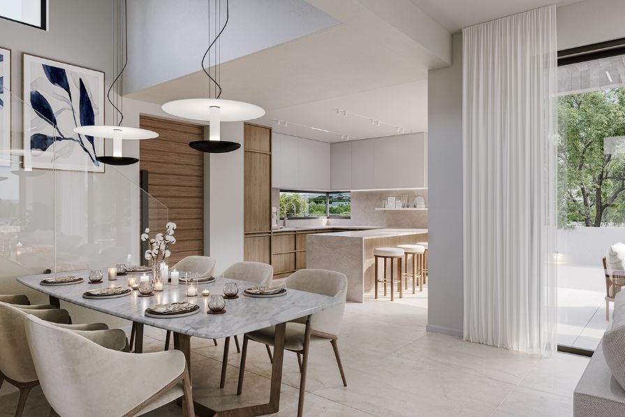 The outdoor space has a private swimming pool, and boasts a covered seating area to unwind by the pool and enjoy the cool of the shade. There is an optional roof terrace which includes an outdoor kitchen, covered seating and will boast panoramic views of the Mediterranean, and an optional lower level for additional living and function space. The property includes private parking.