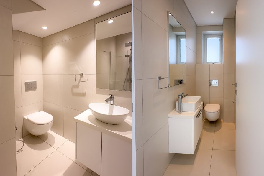The modern kitchen boasts a feature kitchen island, creating a wonderful place to enjoy meals with your loved ones. The living area looks out to the private garden and pool area through floor to ceiling glass sliding doors. There is also a guest WC on the ground floor.