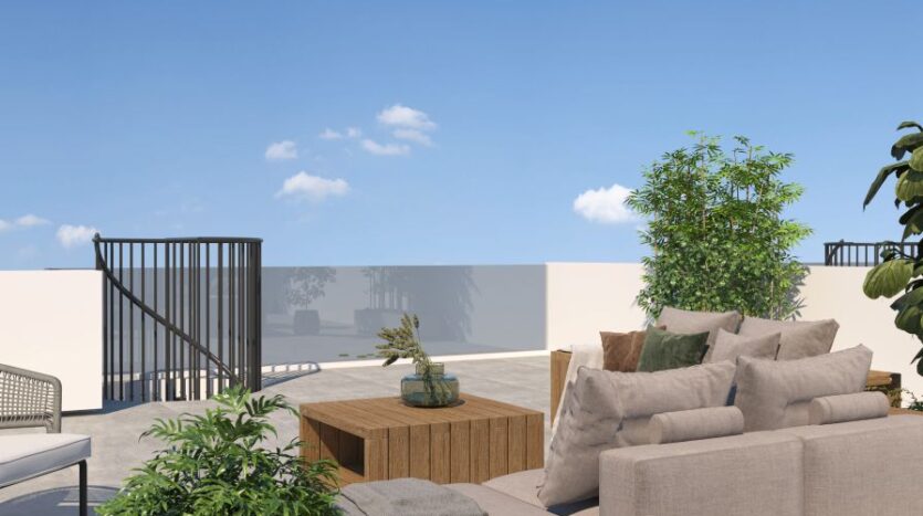 The property features an open-plan layout with an integrated kitchen, seamlessly flowing into the spacious living and dining area. Large sliding doors lead to a private balcony, that provides access to the private roof garden- an exceptional space for relaxation or entertaining while enjoying scenic views.