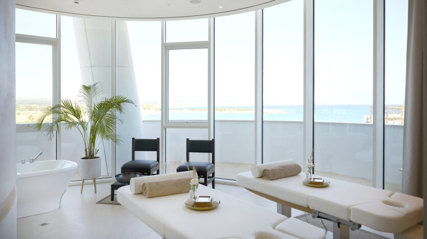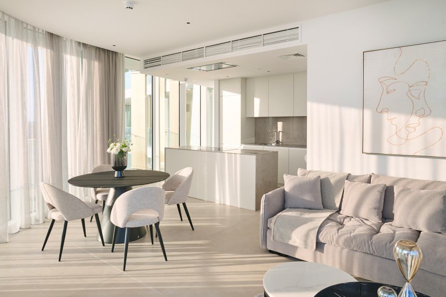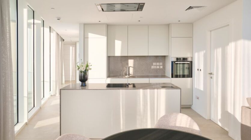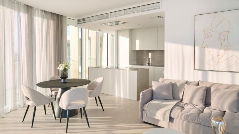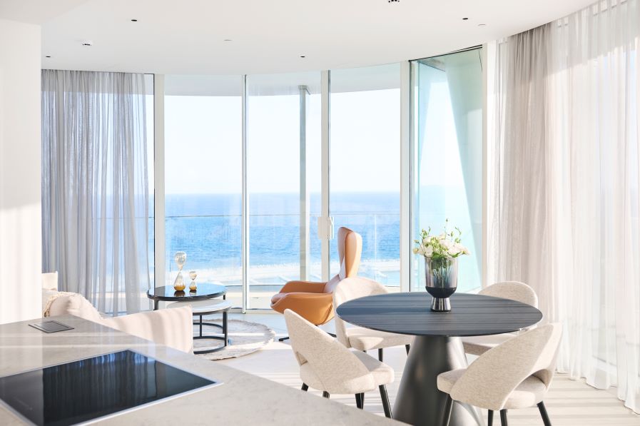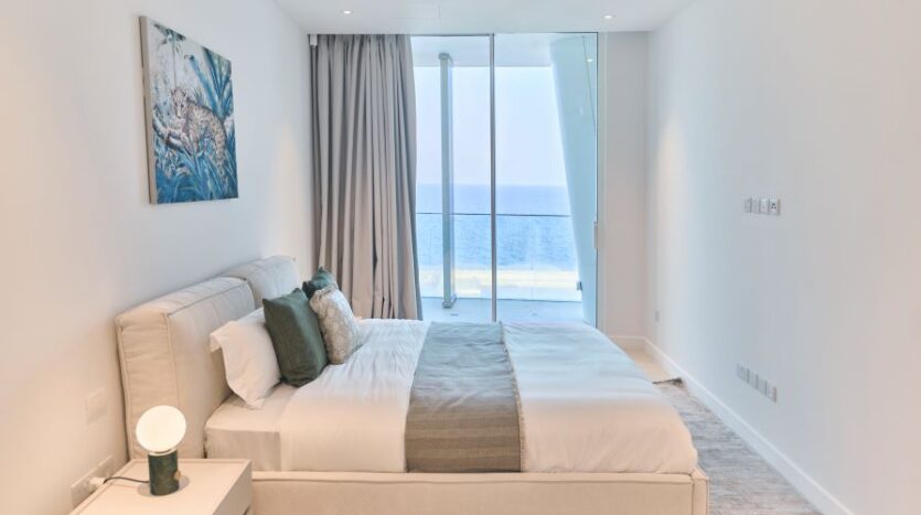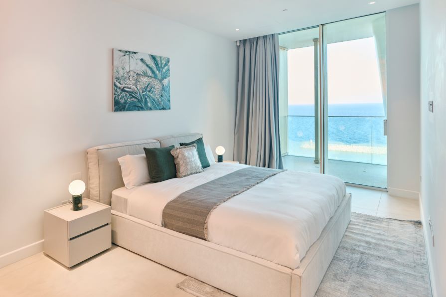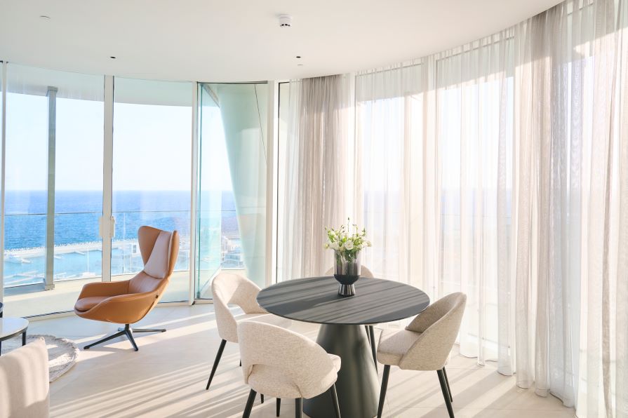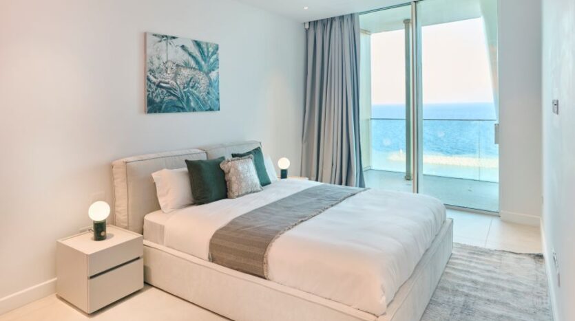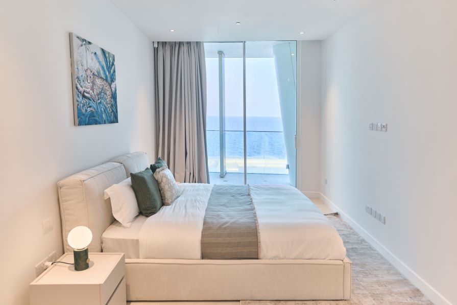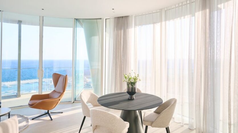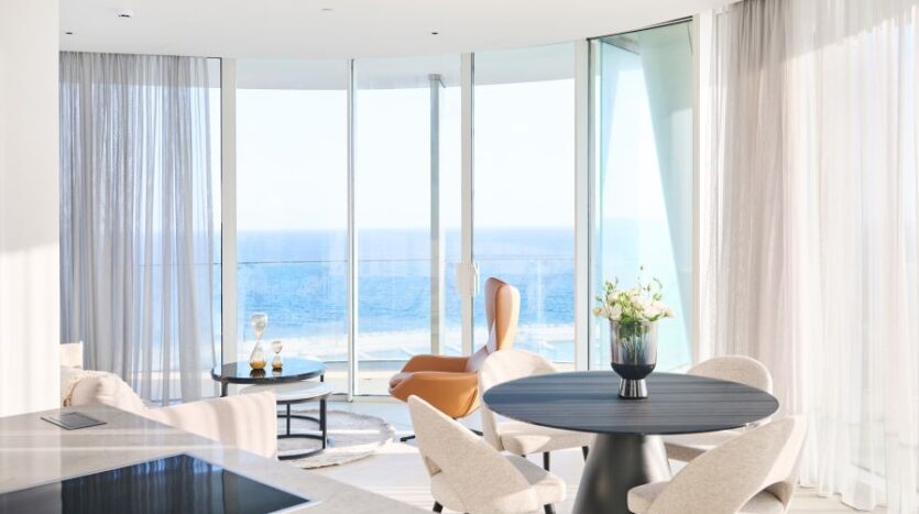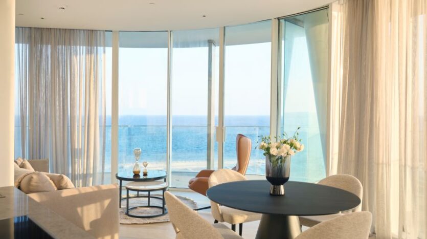 Inside, the open-concept living space is bathed in natural light with high-end finishes throughout blending with modern design, neutral colors and natural materials to create a serenity and an inviting atmosphere. The gourmet kitchen is outfitted with top-of-the-line appliances and a large island perfect for entertaining. The living area is expansive with plush seating that faces the sea and huge sliding doors that connect the interior to an external 360 veranda offering uninterrupted view of the sea and perfect for al-fresco dining. This space also features a guest toilet.