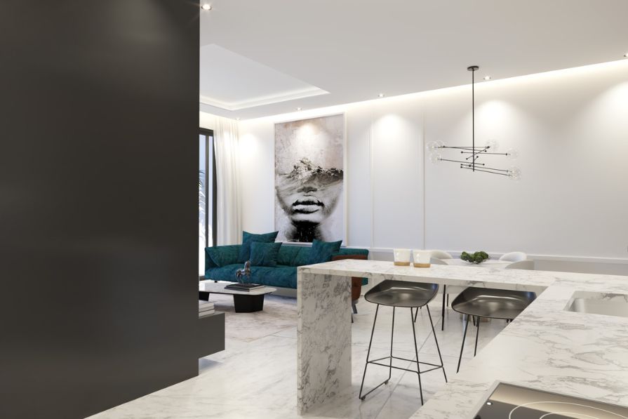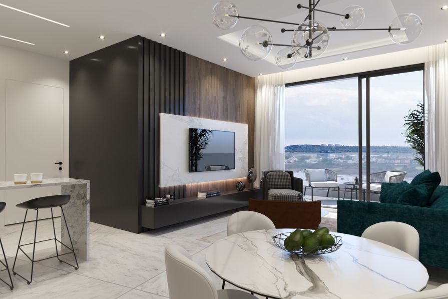The open-plan layout creates a warm and inviting atmosphere, featuring a modern kitchen, stylish dining area with a breakfast bar, and a cosy living room that opens onto a private terrace overlooking the swimming pool – ideal for relaxing and outdoor dining.