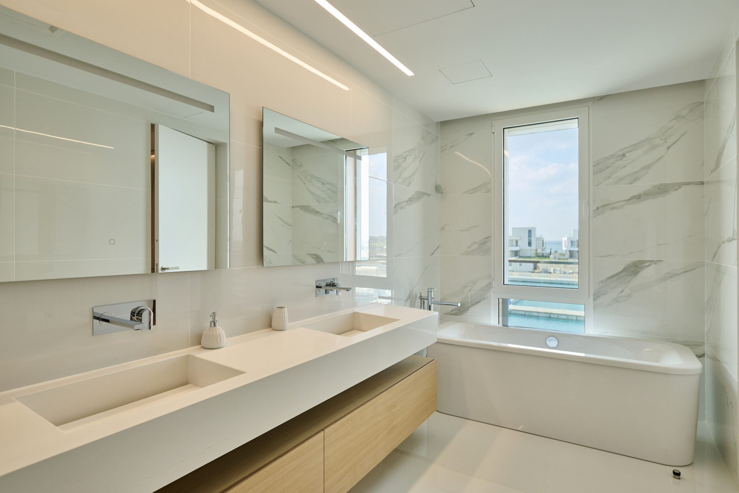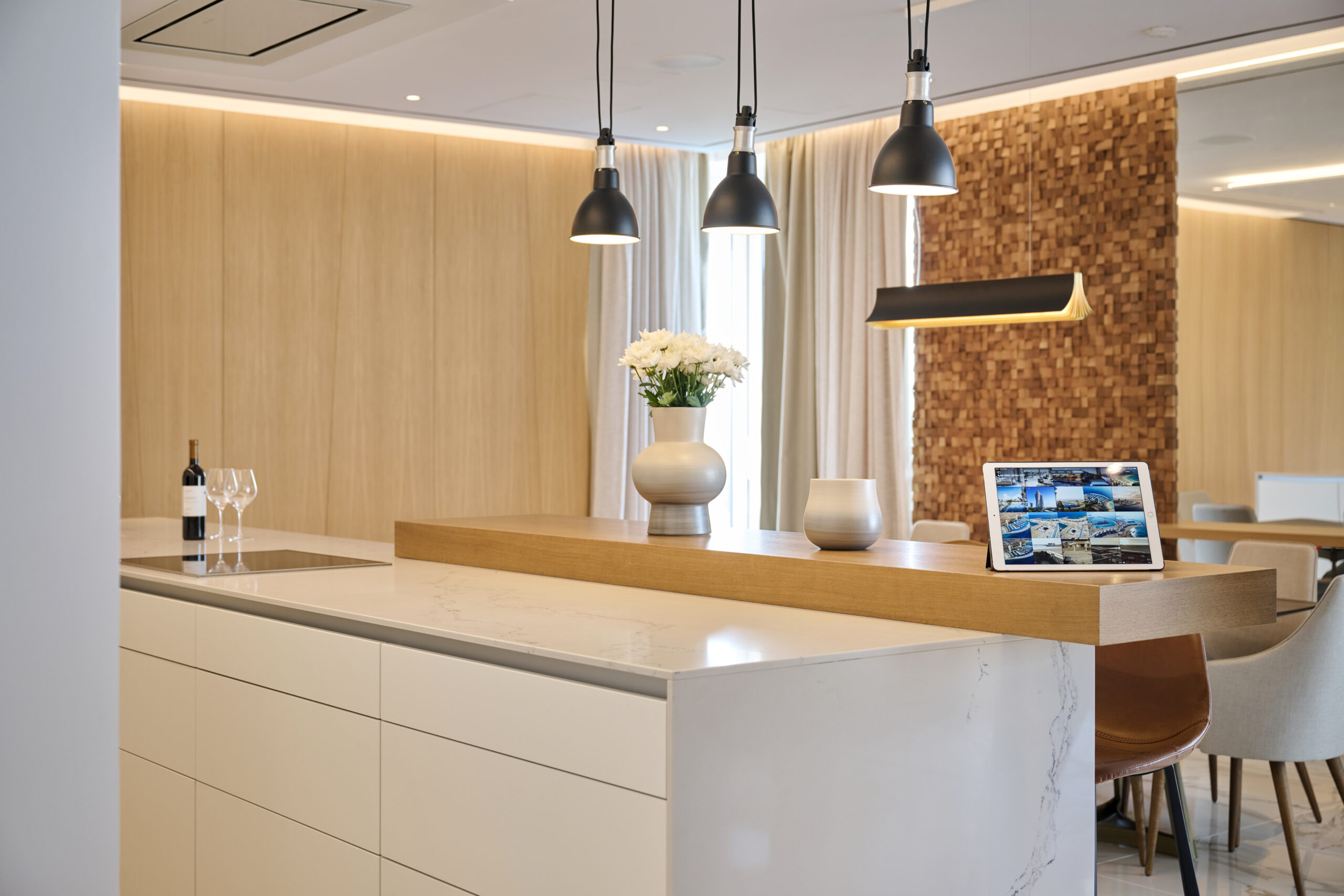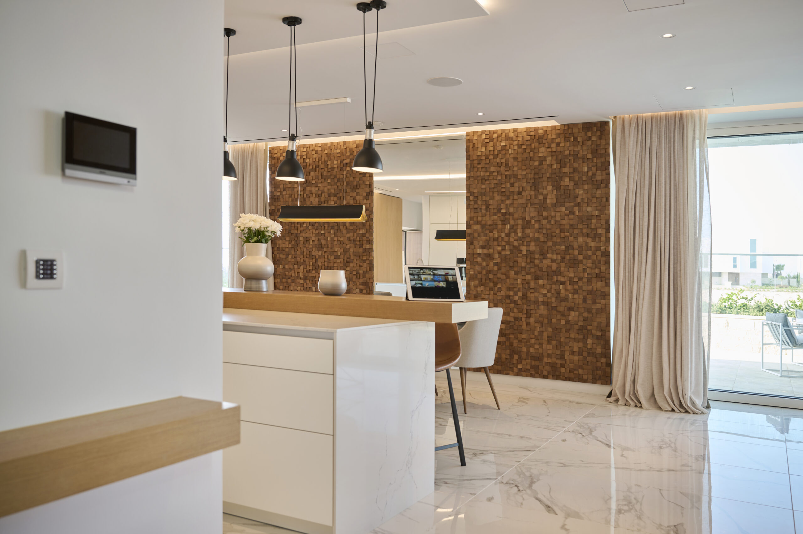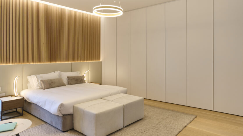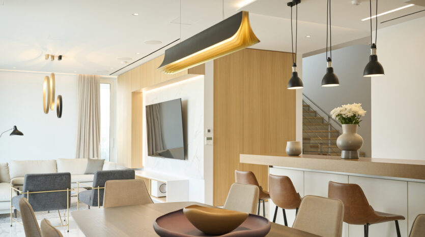 Inside, the open-concept living space is bathed in natural light, with high-end finishes throughout, blending with the polished marble floors and hardwood accents. The gourmet kitchen is outfitted with top-of-the-line appliances, a walk-in pantry and a large island perfect for entertaining. The living area is expansive with plush seating that faces the sea with huge sliding doors that connect the interior to an infinity pool, where the horizon seamlessly blends with the water creating an uninterrupted view of the sea. The ground floor also has a guest toilet.