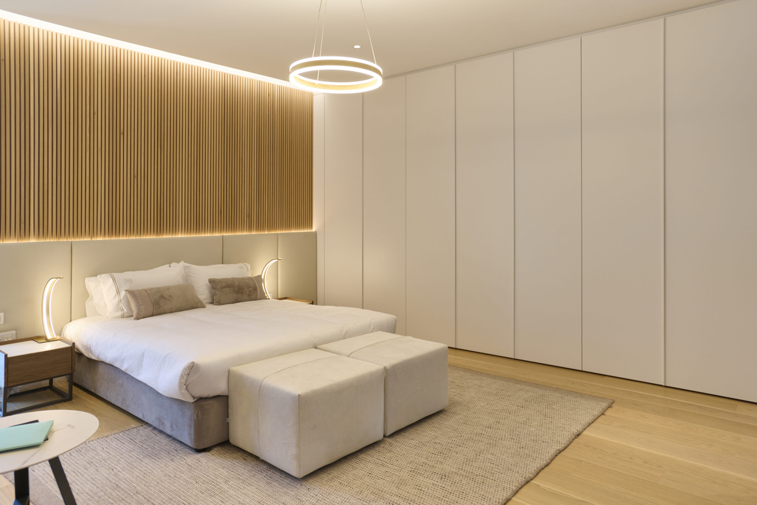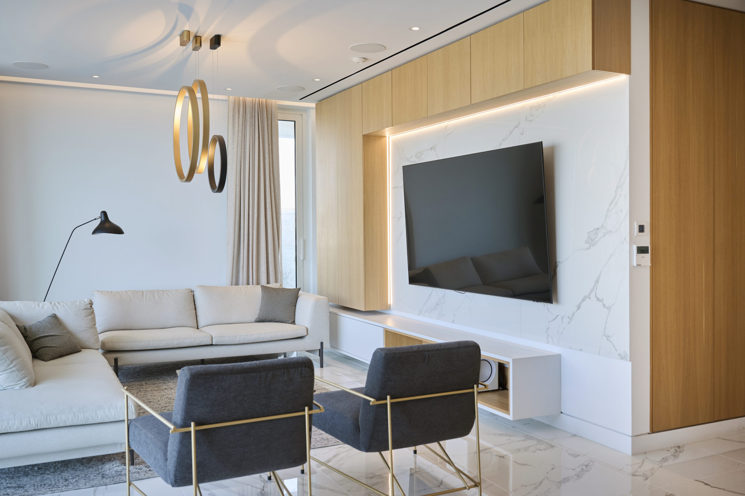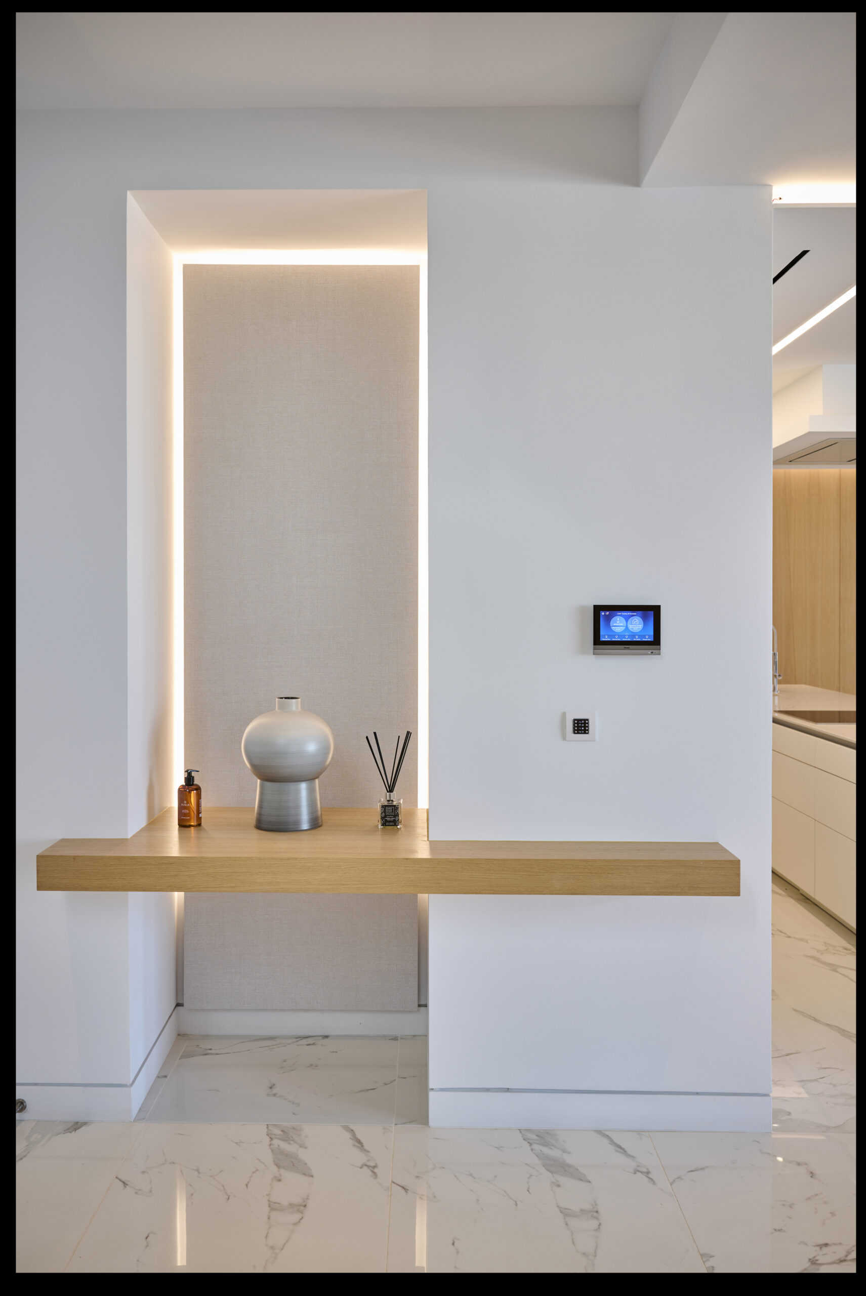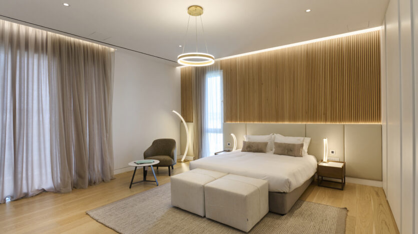 Inside, the open-concept living space is bathed in natural light, with high-end finishes throughout, blending with the polished marble floors and hardwood accents. The gourmet kitchen is outfitted with top-of-the-line appliances, a walk-in pantry and a large island perfect for entertaining. The living area is expansive with plush seating that faces the sea with huge sliding doors that connect the interior to an infinity pool, where the horizon seamlessly blends with the water creating an uninterrupted view of the sea. The ground floor also has a guest toilet.