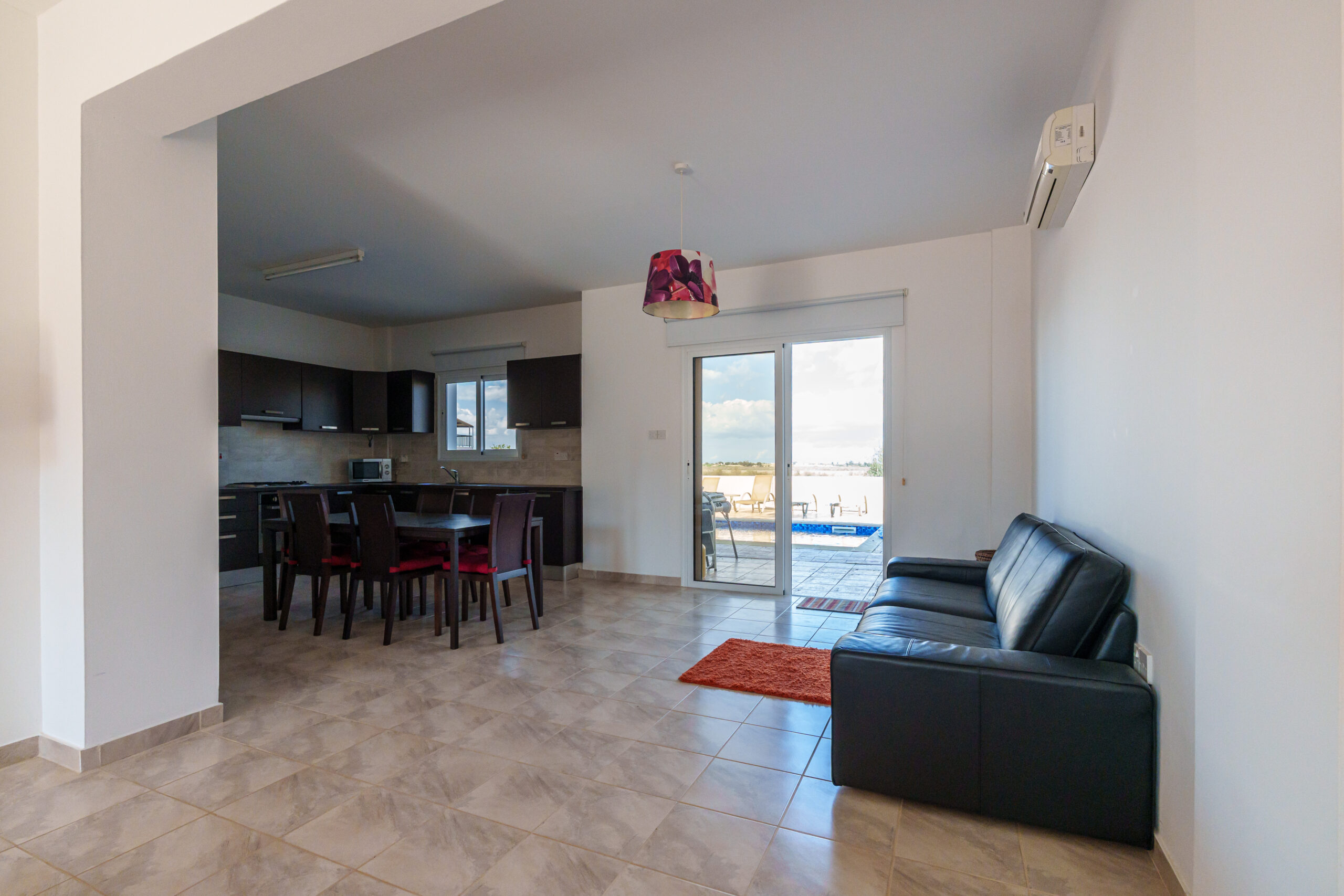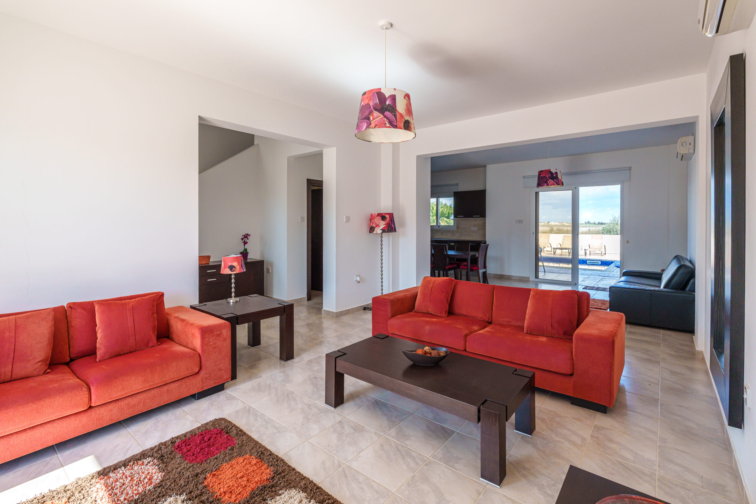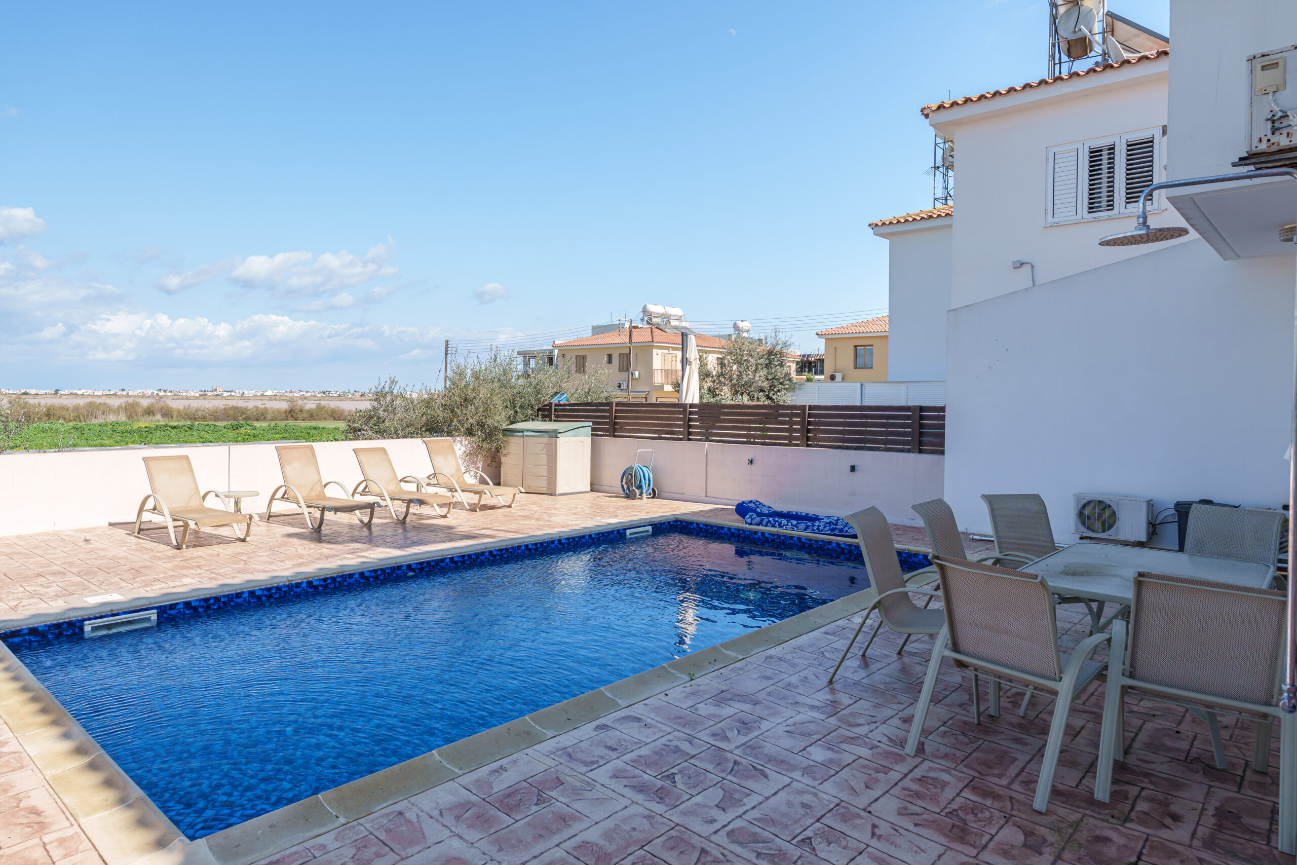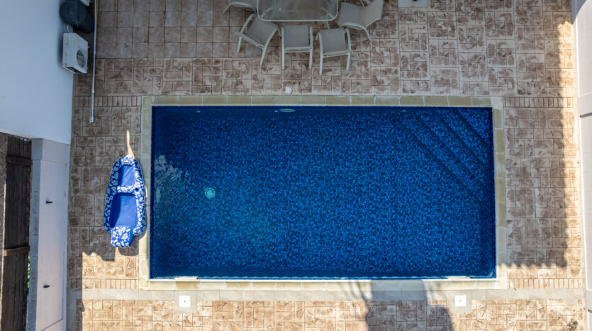 Outdoors, the villa boasts a large private swimming pool, perfect for lounging, entertaining, or family gatherings. Additional features include a private garage and an outdoor shower for extra convenience.