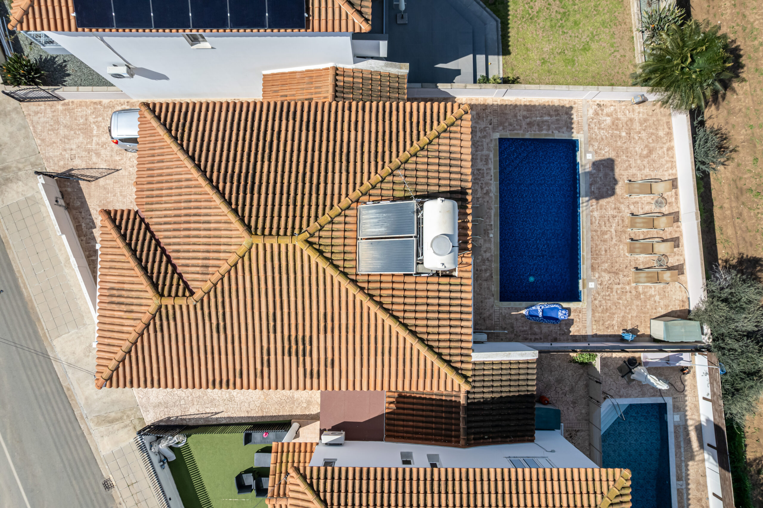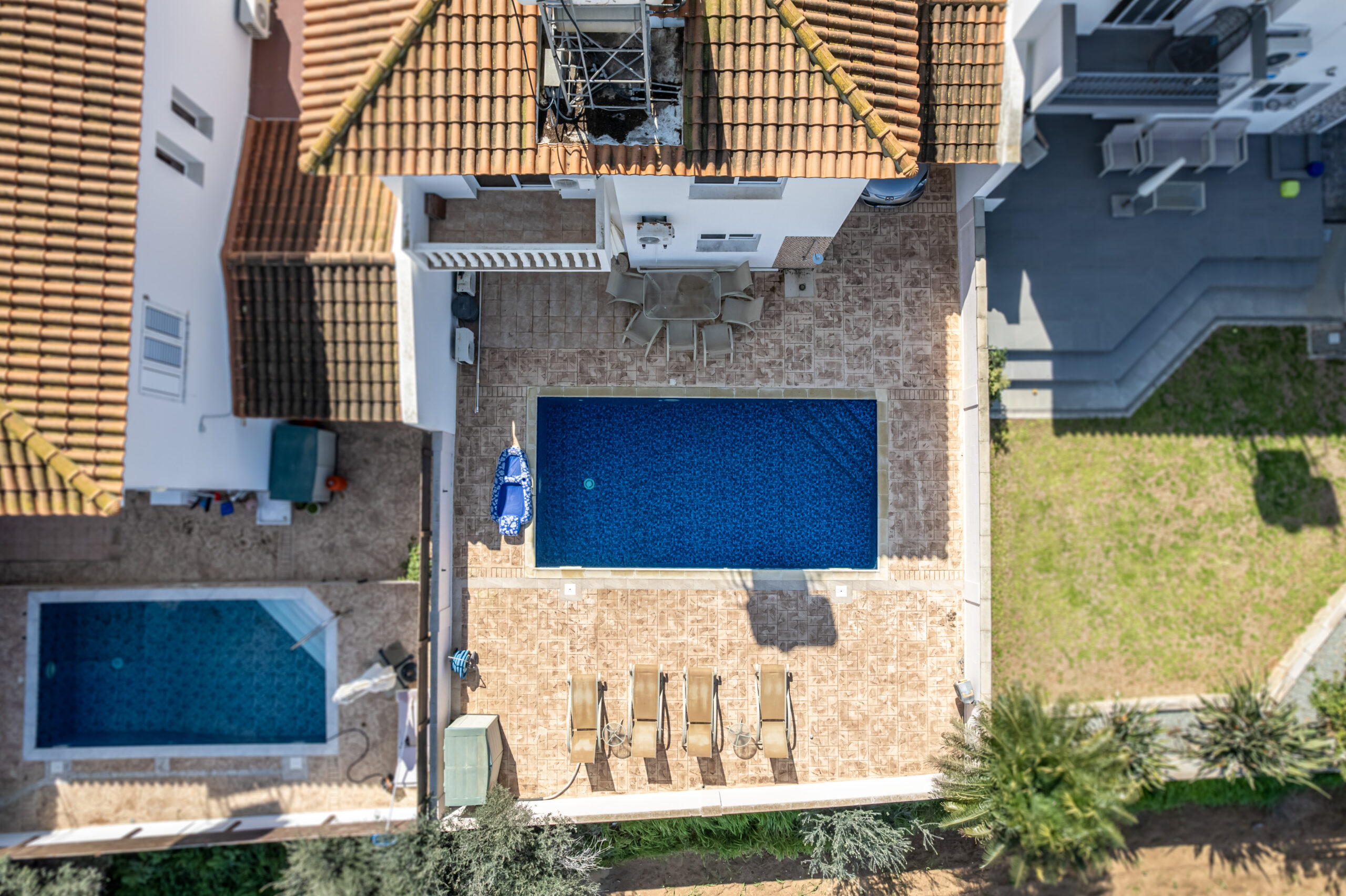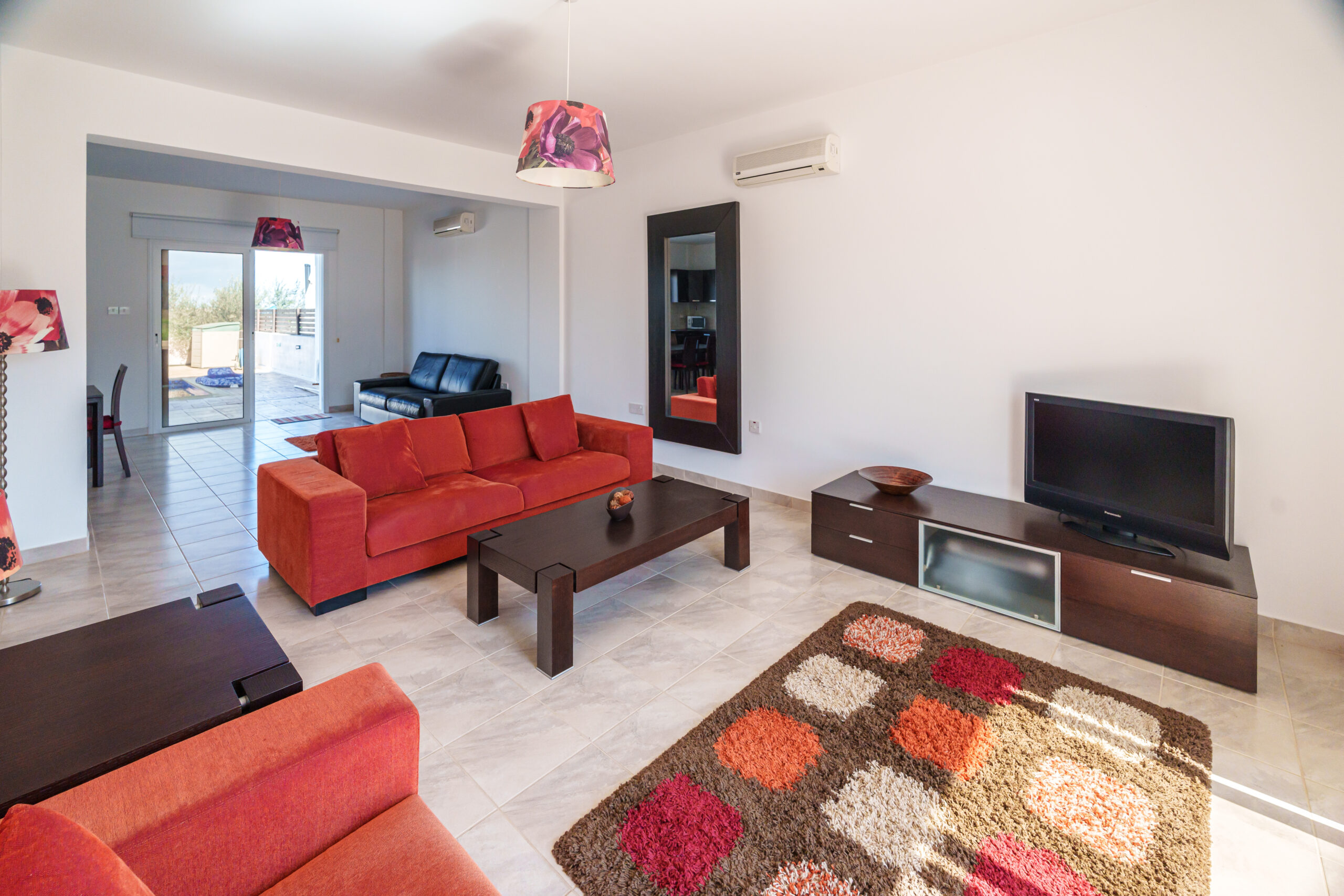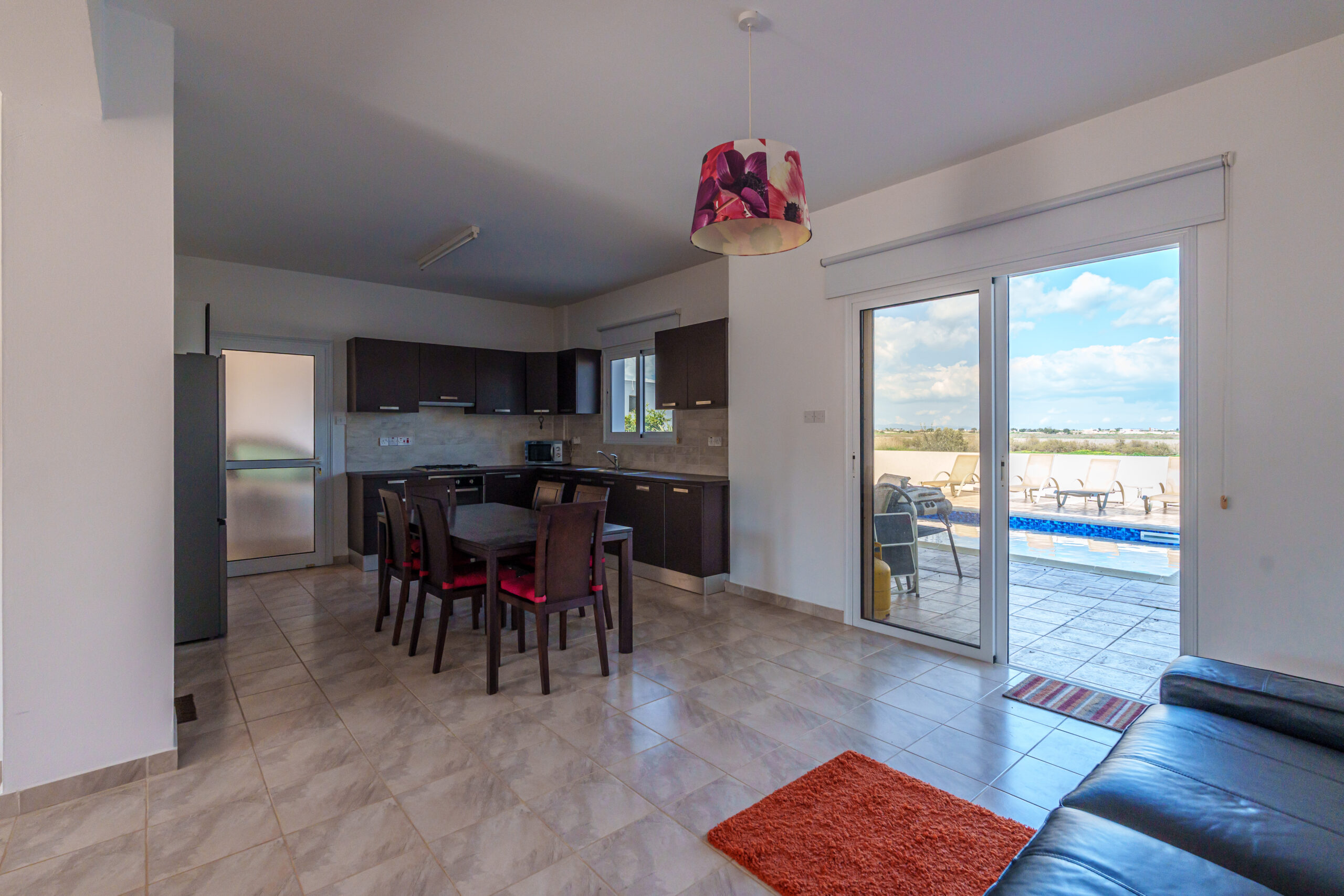 Outdoors, the villa boasts a large private swimming pool, perfect for lounging, entertaining, or family gatherings. Additional features include a private garage and an outdoor shower for extra convenience.